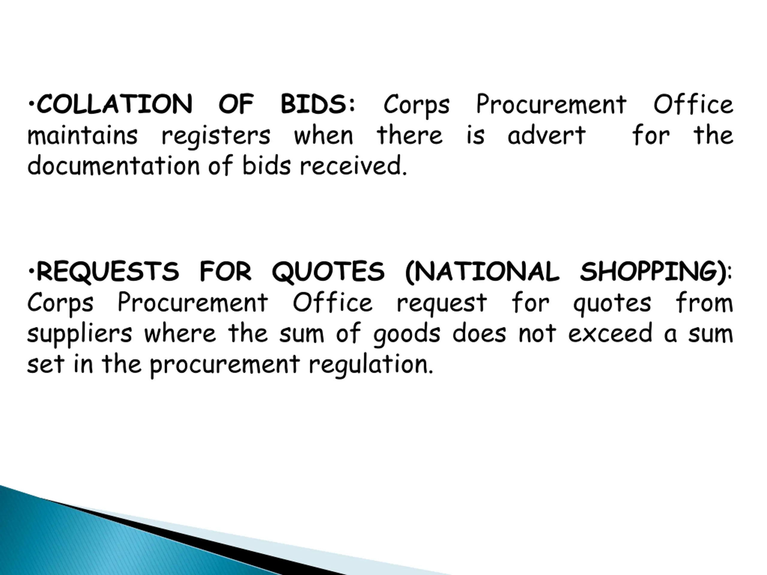 COLLATION OF BIDS: Corps Procurement Office maintains registers when there is advert for the documentation of bids received. REQUESTS FOR QUOTES (NATIONAL SHOPPING): Corps Procurement Office request for quotes from suppliers where the sum of goods does not exceed a sum set in the procurement regulation.