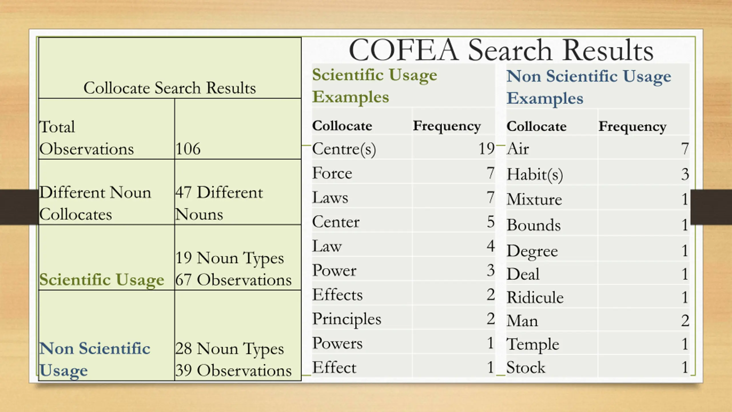 COFEA Search Results Scientific Usage Examples Non Scientific Usage Examples Collocate Search Results Total Observations Collocate Centre(s) Force Laws Center Law Power Effects Principles Powers Effect Frequency Collocate Air Habit(s) Mixture Bounds Degree Deal Ridicule Man Temple Stock Frequency 7 3 1 1 1 1 1 2 1 1 19 106 7 7 5 4 3 2 2 1 1 Different Noun Collocates 47 Different Nouns 19 Noun Types 67 Observations Scientific Usage Non Scientific Usage 28 Noun Types 39 Observations