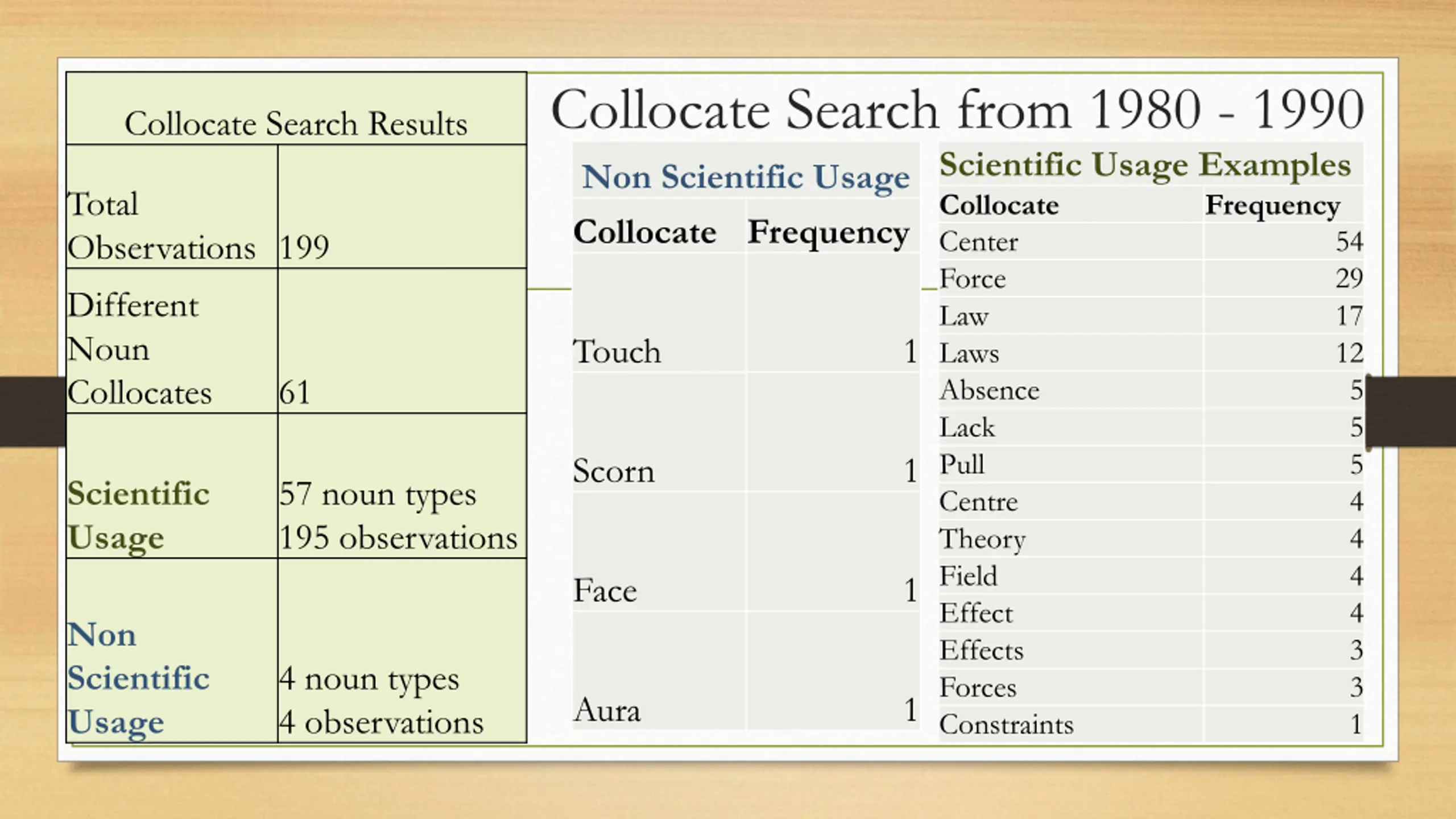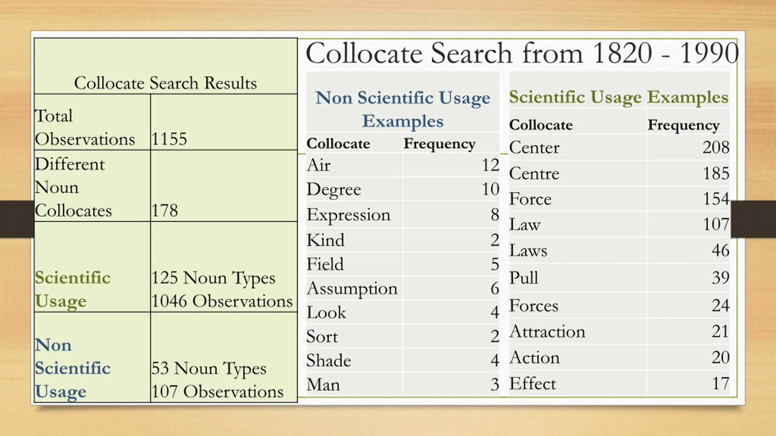 Collocate Search from 1820 - 1990 Collocate Search Results Scientific Usage Examples Collocate Center Centre Force Law Laws Pull Forces Attraction Action Effect Non Scientific Usage Examples Collocate Air Degree Expression Kind Field Assumption Look Sort Shade Man Total Observations 1155 Different Noun Collocates Frequency Frequency 208 185 154 107 46 39 24 21 20 17 12 10 178 8 2 5 6 4 2 4 3 Scientific Usage 125 Noun Types 1046 Observations Non Scientific Usage 53 Noun Types 107 Observations