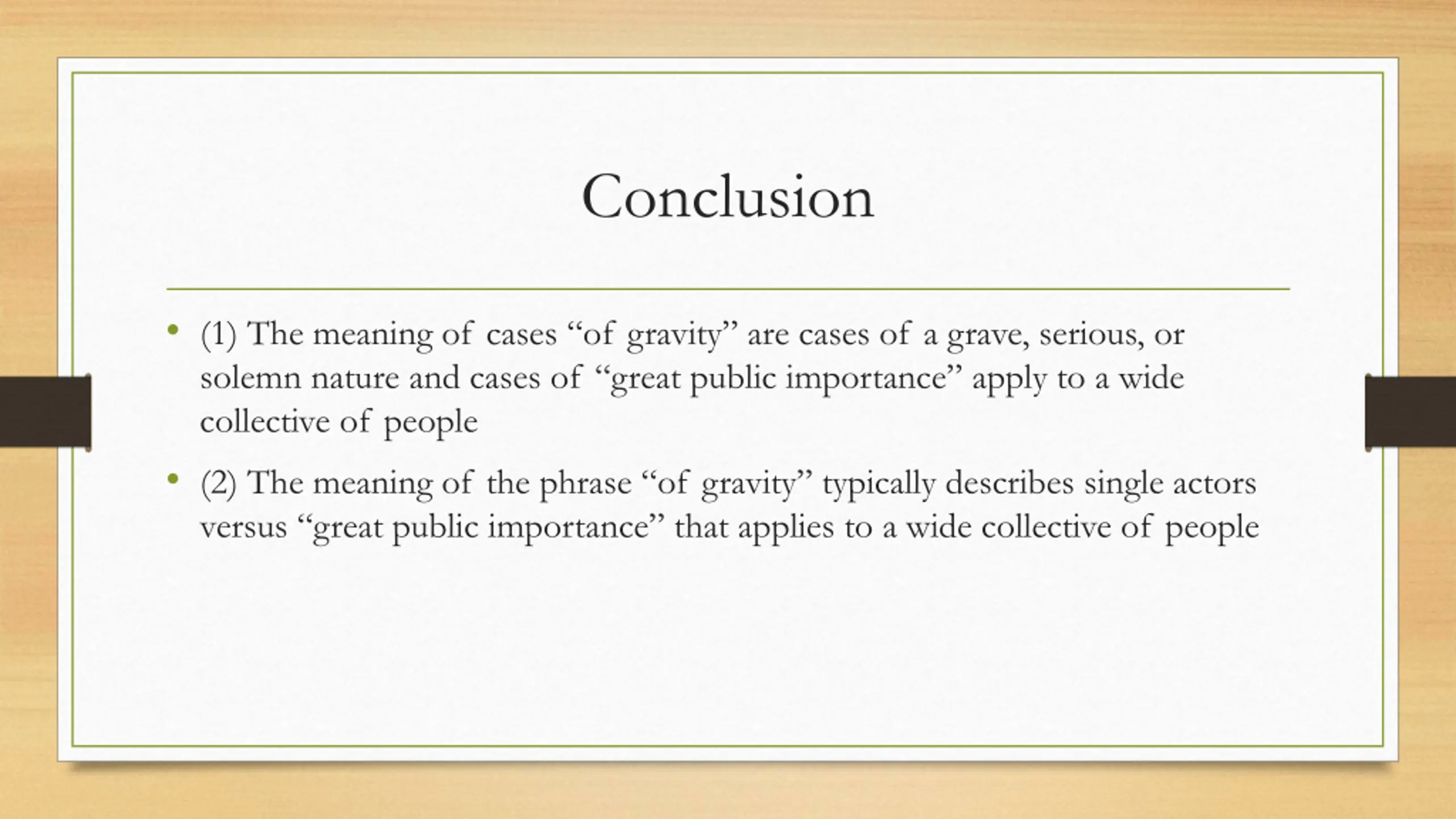 Conclusion (1) The meaning of cases of gravity are cases of a grave, serious, or solemn nature and cases of great public importance apply to a wide collective of people (2) The meaning of the phrase of gravity typically describes single actors versus great public importance that applies to a wide collective of people