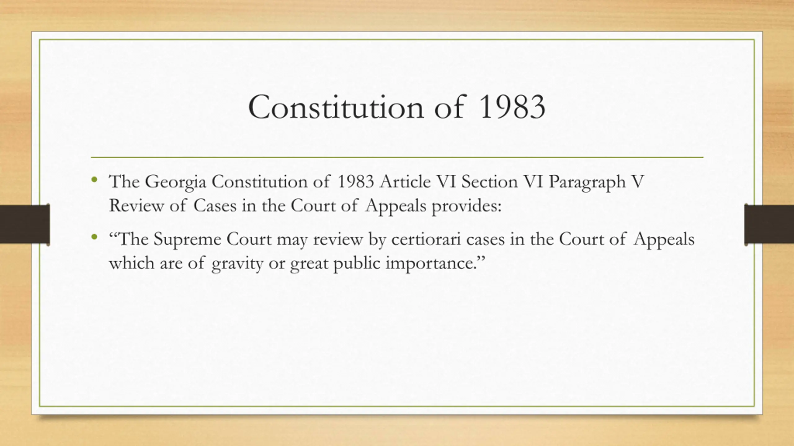 Constitution of 1983 The Georgia Constitution of 1983 Article VI Section VI Paragraph V Review of Cases in the Court of Appeals provides: The Supreme Court may review by certiorari cases in the Court of Appeals which are of gravity or great public importance.