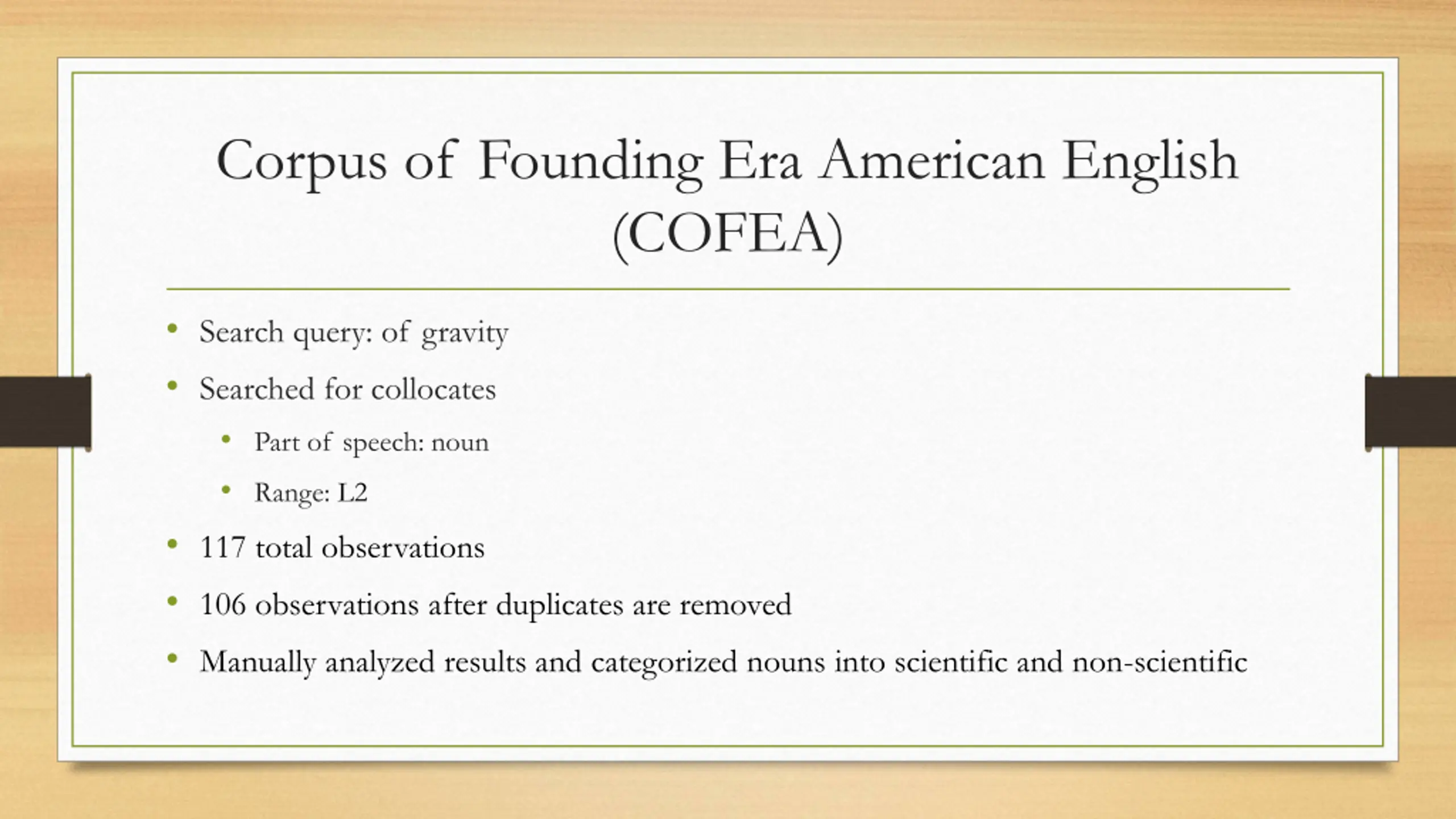 Corpus of Founding Era American English (COFEA) Search query: of gravity Searched for collocates Part of speech: noun Range: L2 117 total observations 106 observations after duplicates are removed Manually analyzed results and categorized nouns into scientific and non-scientific