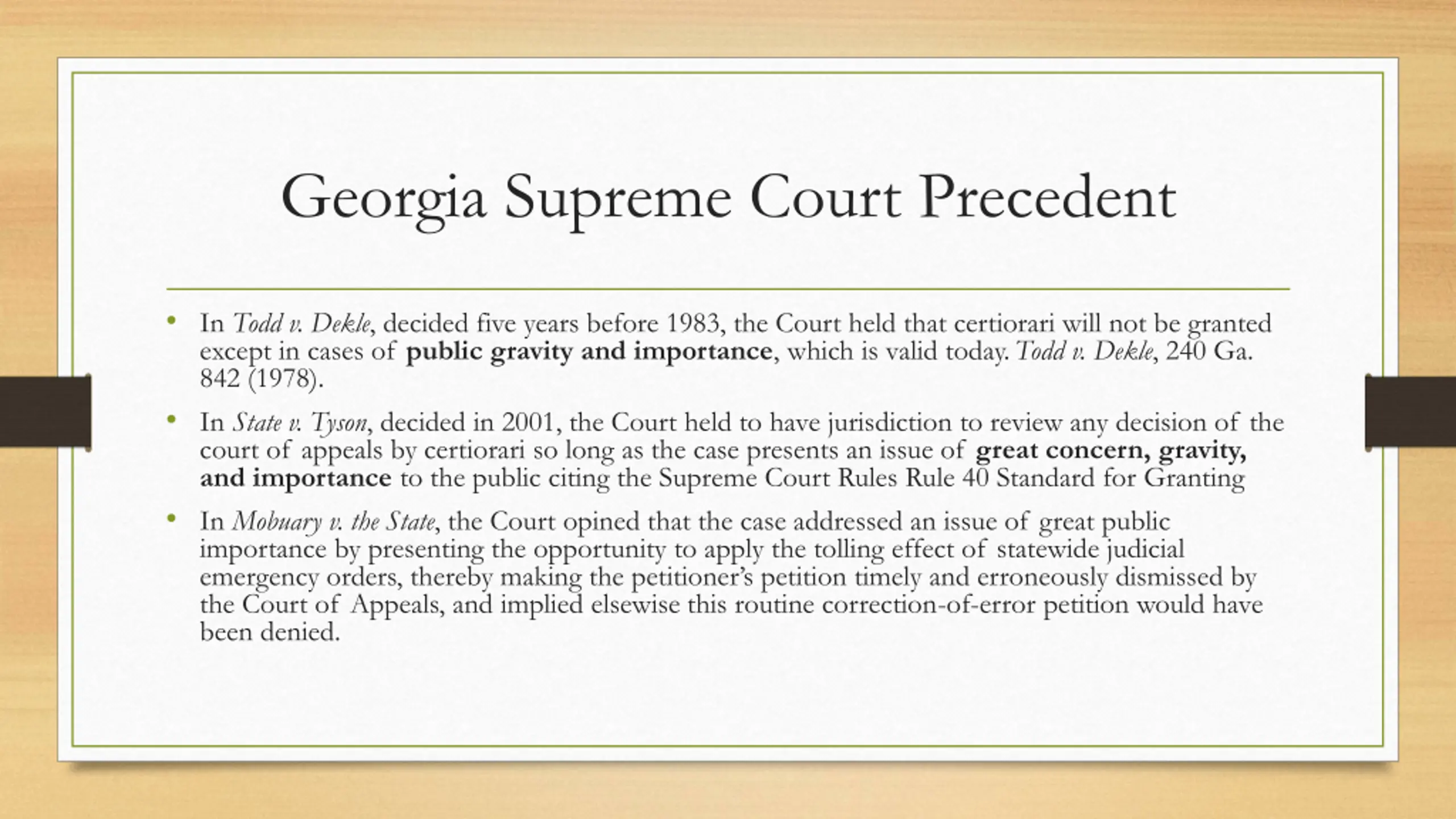 Georgia Supreme Court Precedent In Todd v. Dekle, decided five years before 1983, the Court held that certiorari will not be granted except in cases of public gravity and importance, which is valid today.Todd v. Dekle, 240 Ga. 842 (1978). In State v. Tyson, decided in 2001, the Court held to have jurisdiction to review any decision of the court of appeals by certiorari so long as the case presents an issue of great concern, gravity, and importance to the public citing the Supreme Court Rules Rule 40 Standard for Granting In Mobuary v. the State, the Court opined that the case addressed an issue of great public importance by presenting the opportunity to apply the tolling effect of statewide judicial emergency orders, thereby making the petitioner s petition timely and erroneously dismissed by the Court of Appeals, and implied elsewise this routine correction-of-error petition would have been denied.