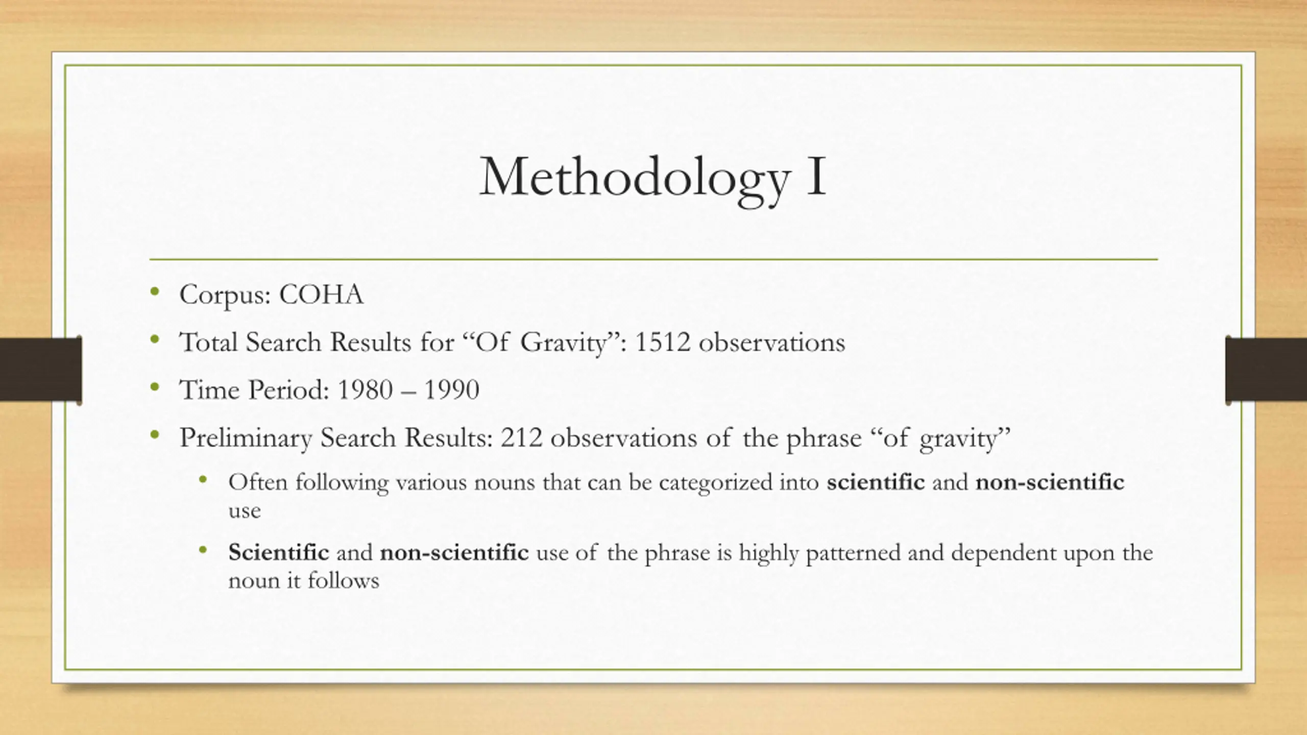 Methodology I Corpus: COHA Total Search Results for Of Gravity : 1512 observations Time Period: 1980 1990 Preliminary Search Results: 212 observations of the phrase of gravity Often following various nouns that can be categorized into scientific and non-scientific use Scientific and non-scientific use of the phrase is highly patterned and dependent upon the noun it follows