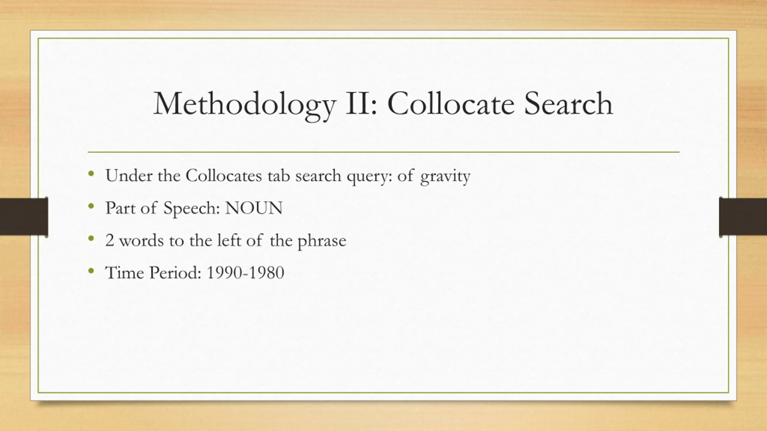 Methodology II: Collocate Search Under the Collocates tab search query: of gravity Part of Speech: NOUN 2 words to the left of the phrase Time Period: 1990-1980