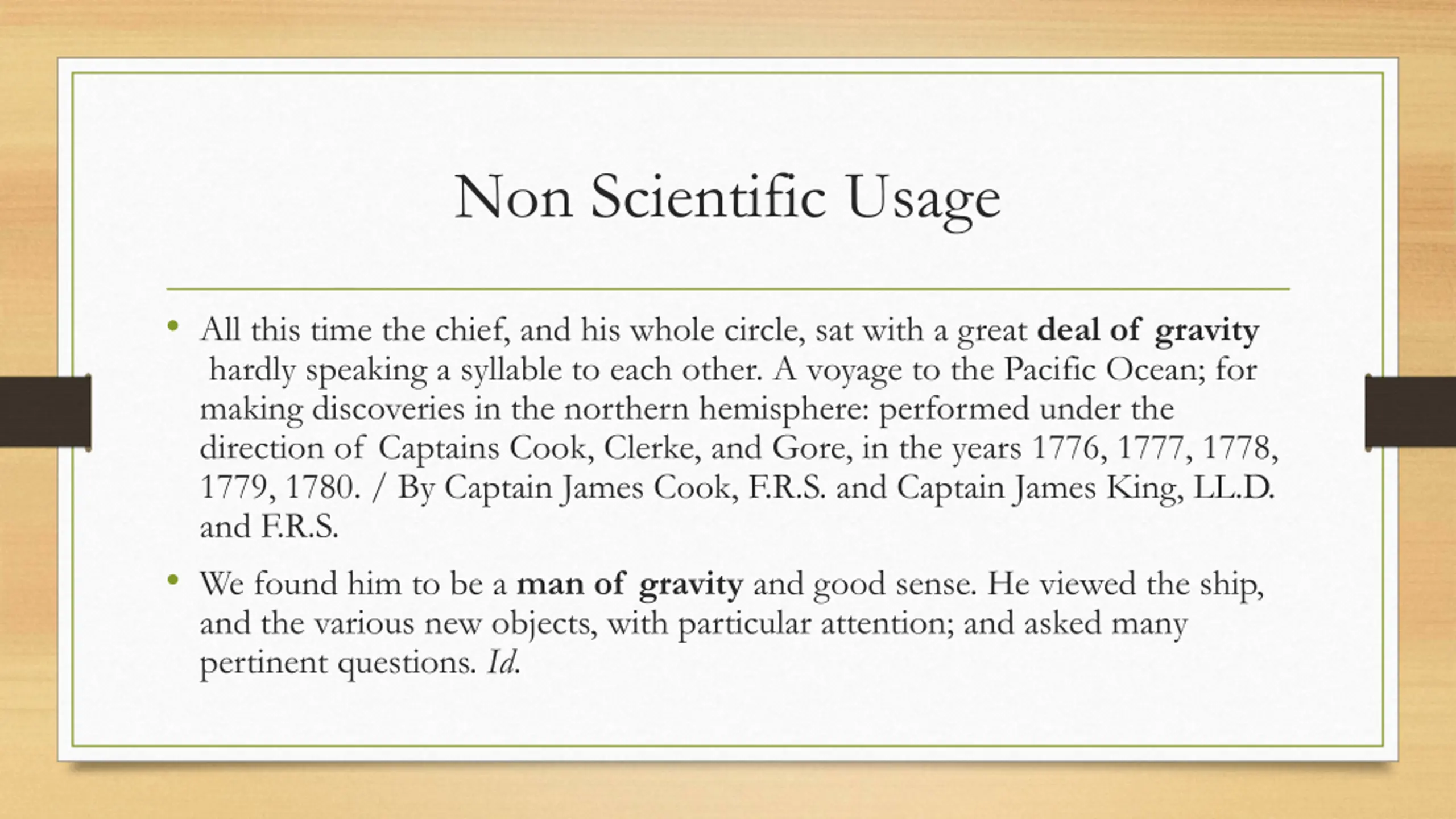 Non Scientific Usage All this time the chief, and his whole circle, sat with a great deal of gravity hardly speaking a syllable to each other. A voyage to the Pacific Ocean; for making discoveries in the northern hemisphere: performed under the direction of Captains Cook, Clerke, and Gore, in the years 1776, 1777, 1778, 1779, 1780. / By Captain James Cook, F.R.S. and Captain James King, LL.D. and F.R.S. We found him to be a man of gravity and good sense. He viewed the ship, and the various new objects, with particular attention; and asked many pertinent questions. Id.