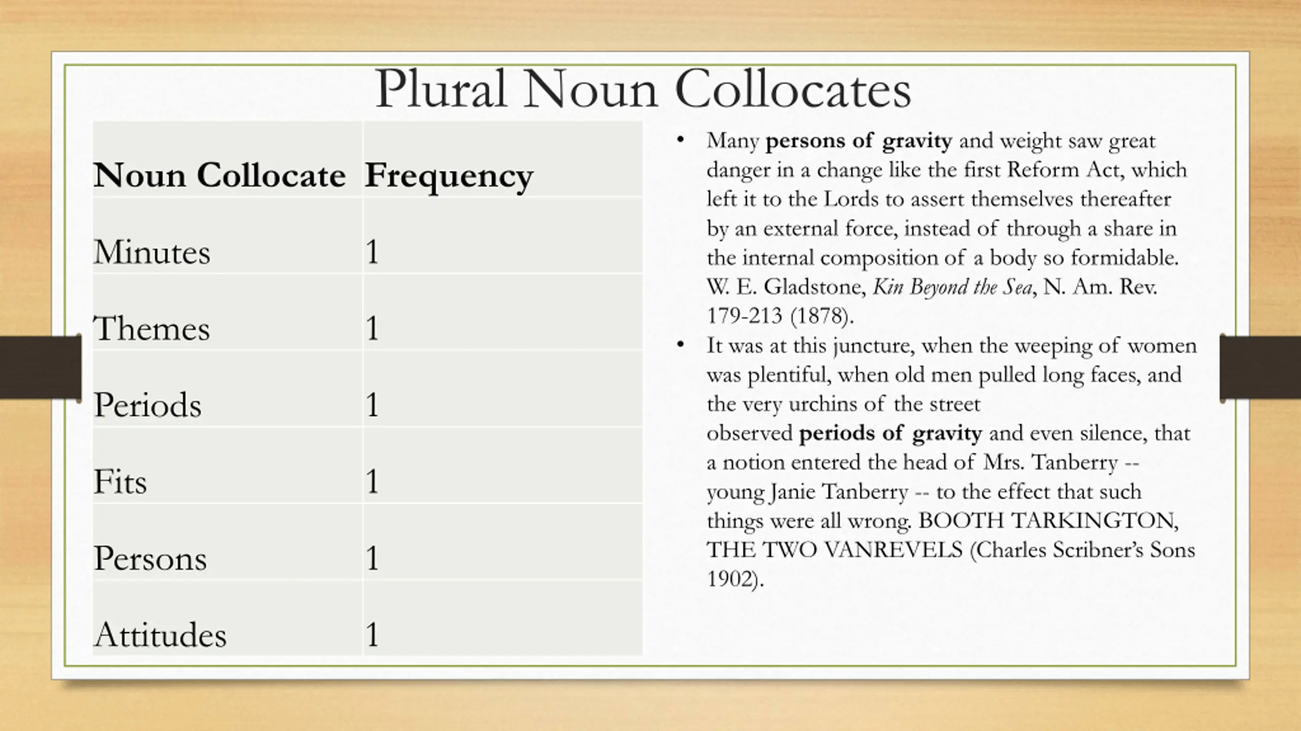 Plural Noun Collocates Many persons of gravity and weight saw great danger in a change like the first Reform Act, which left it to the Lords to assert themselves thereafter by an external force, instead of through a share in the internal composition of a body so formidable. W. E. Gladstone, Kin Beyond the Sea, N. Am. Rev. 179-213 (1878). It was at this juncture, when the weeping of women was plentiful, when old men pulled long faces, and the very urchins of the street observed periods of gravity and even silence, that a notion entered the head of Mrs. Tanberry -- young Janie Tanberry -- to the effect that such things were all wrong. BOOTH TARKINGTON, THE TWO VANREVELS (Charles Scribner s Sons 1902). Noun Collocate Frequency Minutes 1 Themes 1 Periods 1 Fits 1 Persons 1 Attitudes 1