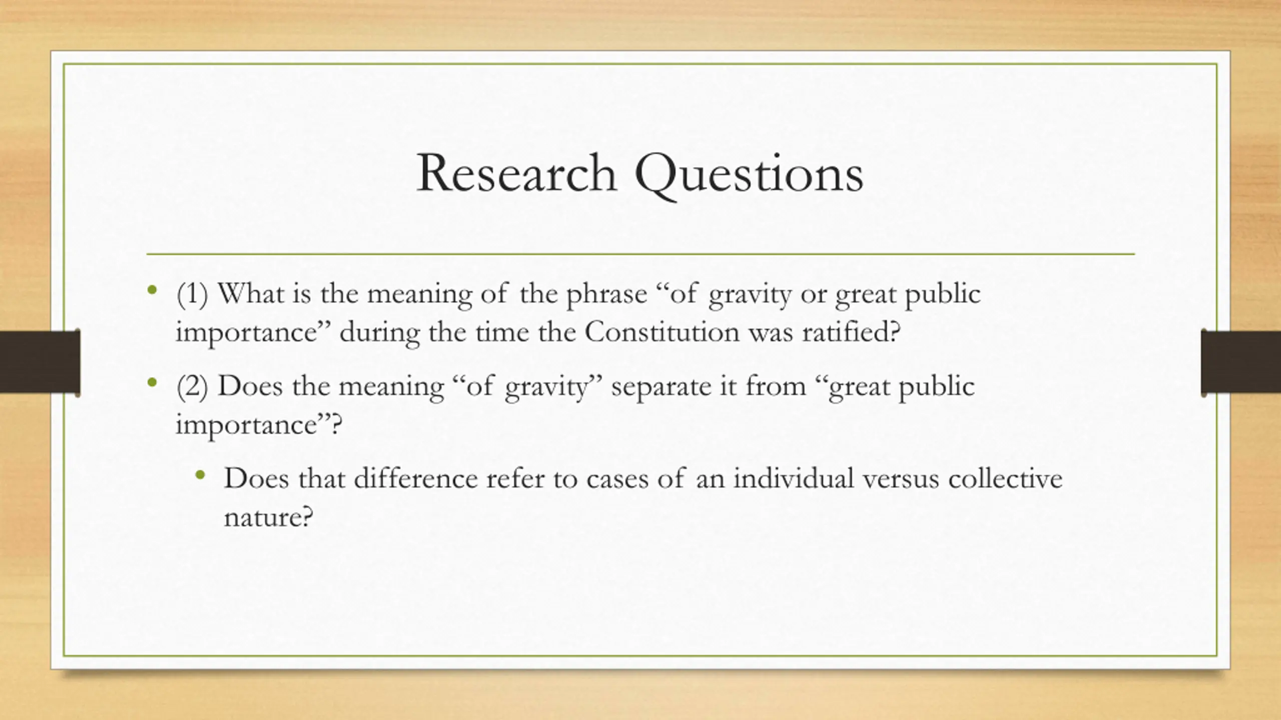Research Questions (1) What is the meaning of the phrase of gravity or great public importance during the time the Constitution was ratified? (2) Does the meaning of gravity separate it from great public importance ? Does that difference refer to cases of an individual versus collective nature?