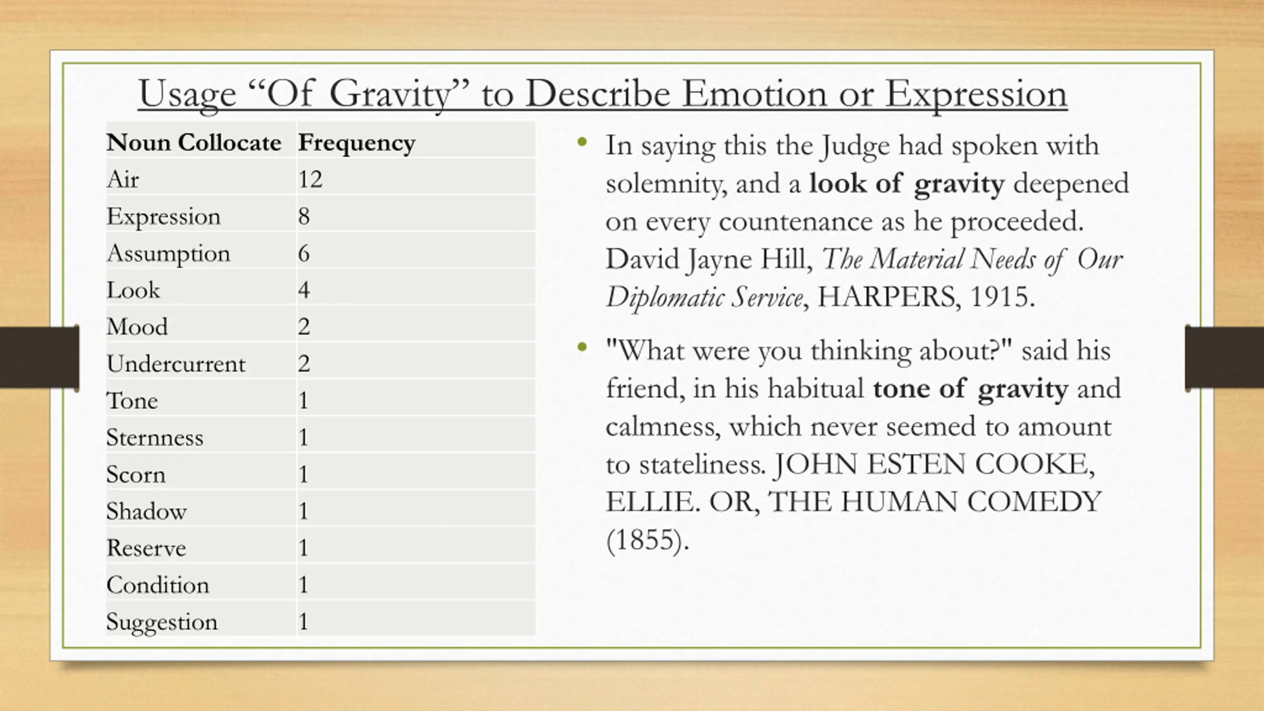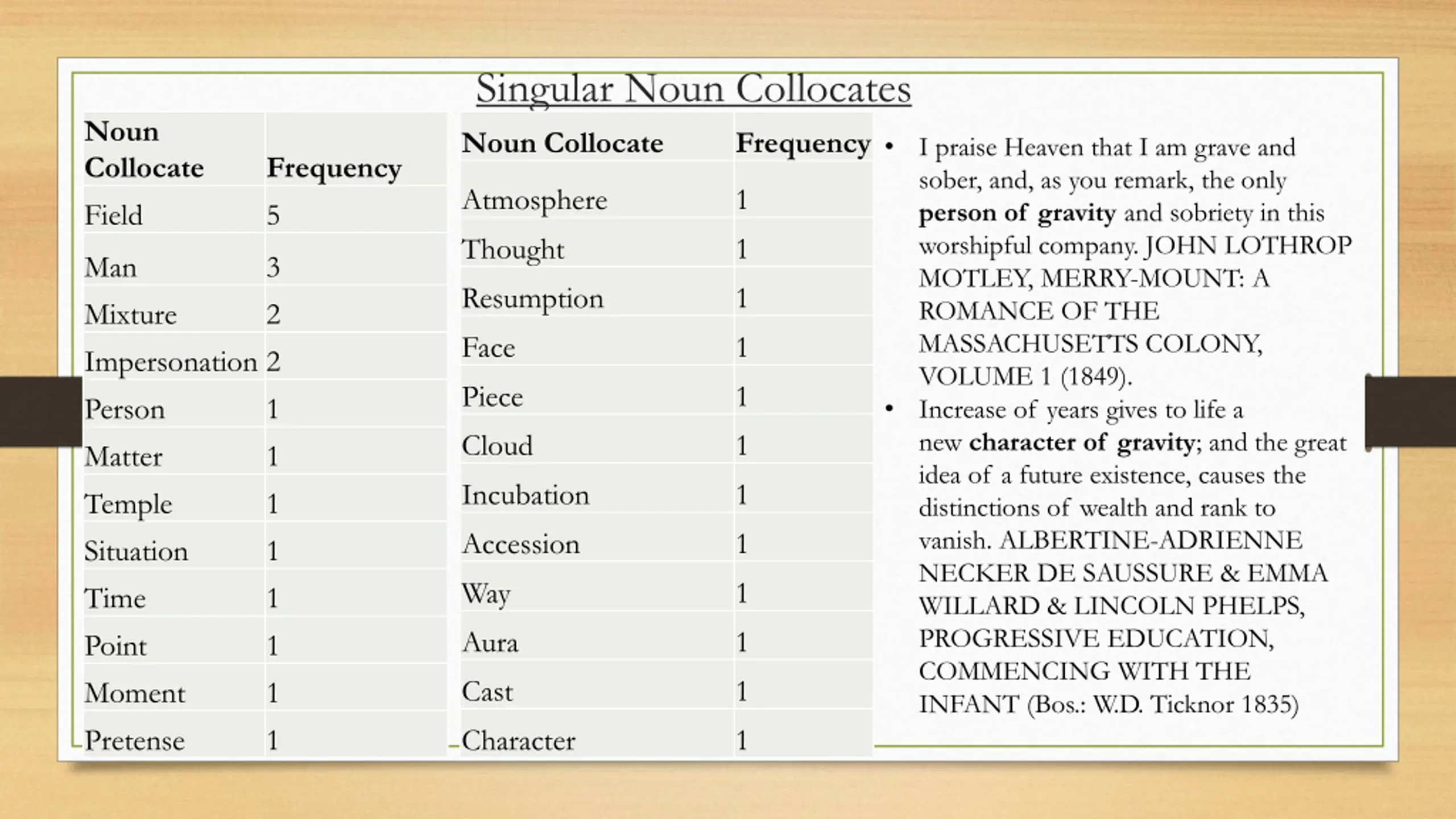 Singular Noun Collocates Noun Collocate Noun Collocate Field Frequency I praise Heaven that I am grave and sober, and, as you remark, the only person of gravity and sobriety in this worshipful company. JOHN LOTHROP MOTLEY, MERRY-MOUNT: A ROMANCE OF THE MASSACHUSETTS COLONY, VOLUME 1 (1849). Increase of years gives to life a new character of gravity; and the great idea of a future existence, causes the distinctions of wealth and rank to vanish. ALBERTINE-ADRIENNE NECKER DE SAUSSURE & EMMA WILLARD & LINCOLN PHELPS, PROGRESSIVE EDUCATION, COMMENCING WITH THE INFANT (Bos.: W.D. Ticknor 1835) Frequency 5 Atmosphere Thought Resumption Face Piece Cloud Incubation Accession Way Aura Cast Character 1 1 1 1 1 1 1 1 1 1 1 1 Man Mixture Impersonation 2 Person Matter Temple Situation Time Point Moment Pretense 3 2 1 1 1 1 1 1 1 1