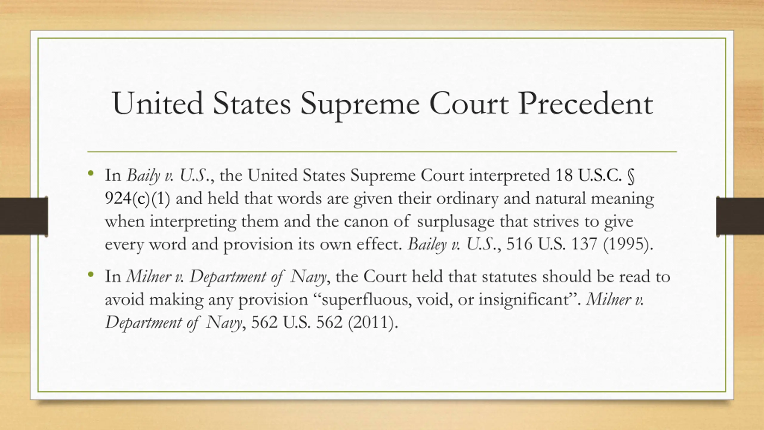 United States Supreme Court Precedent In Baily v. U.S., the United States Supreme Court interpreted 18 U.S.C. 924(c)(1) and held that words are given their ordinary and natural meaning when interpreting them and the canon of surplusage that strives to give every word and provision its own effect. Bailey v. U.S., 516 U.S. 137 (1995). In Milner v. Department of Navy, the Court held that statutes should be read to avoid making any provision superfluous, void, or insignificant . Milner v. Department of Navy, 562 U.S. 562 (2011).