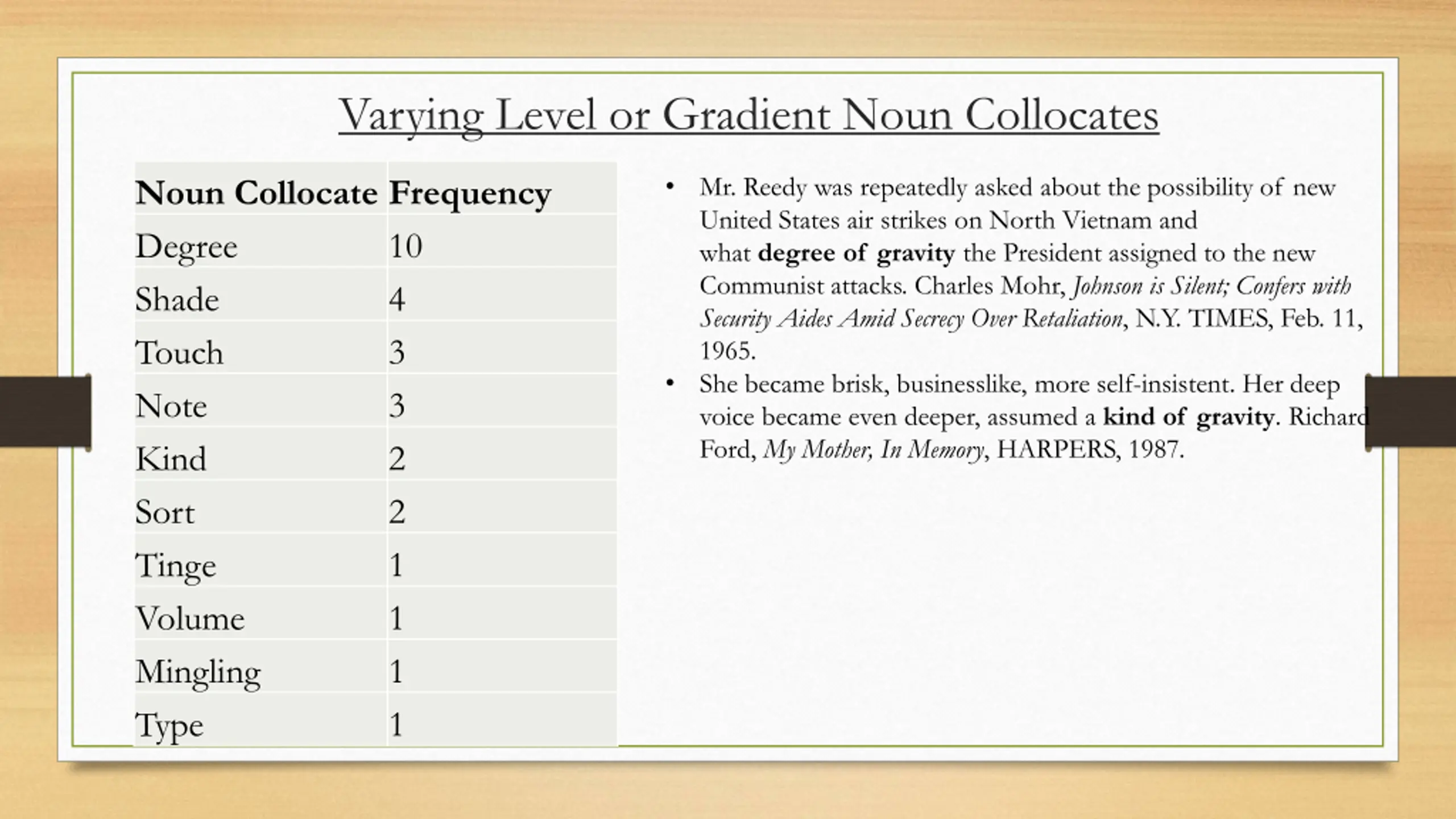 Varying Level or Gradient Noun Collocates Mr. Reedy was repeatedly asked about the possibility of new United States air strikes on North Vietnam and what degree of gravity the President assigned to the new Communist attacks. Charles Mohr, Johnson is Silent; Confers with Security Aides Amid Secrecy Over Retaliation, N.Y. TIMES, Feb. 11, 1965. She became brisk, businesslike, more self-insistent. Her deep voice became even deeper, assumed a kind of gravity. Richard Ford, My Mother, In Memory, HARPERS, 1987. Noun Collocate Frequency Degree Shade Touch Note Kind Sort Tinge Volume Mingling Type 10 4 3 3 2 2 1 1 1 1