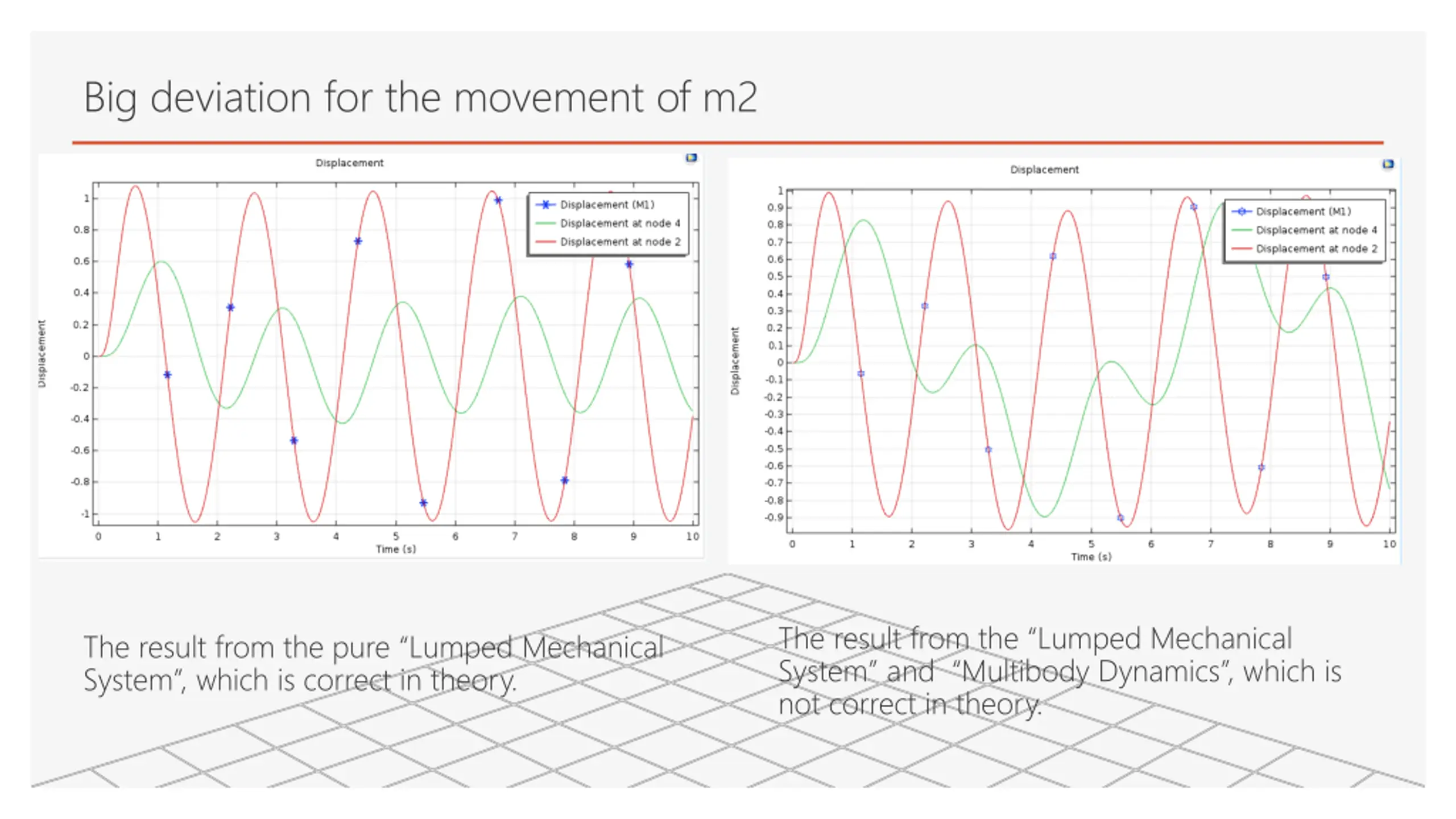 Big deviation for the movement of m2 The result from the Lumped Mechanical System and Multibody Dynamics , which is not correct in theory. The result from the pure Lumped Mechanical System , which is correct in theory.