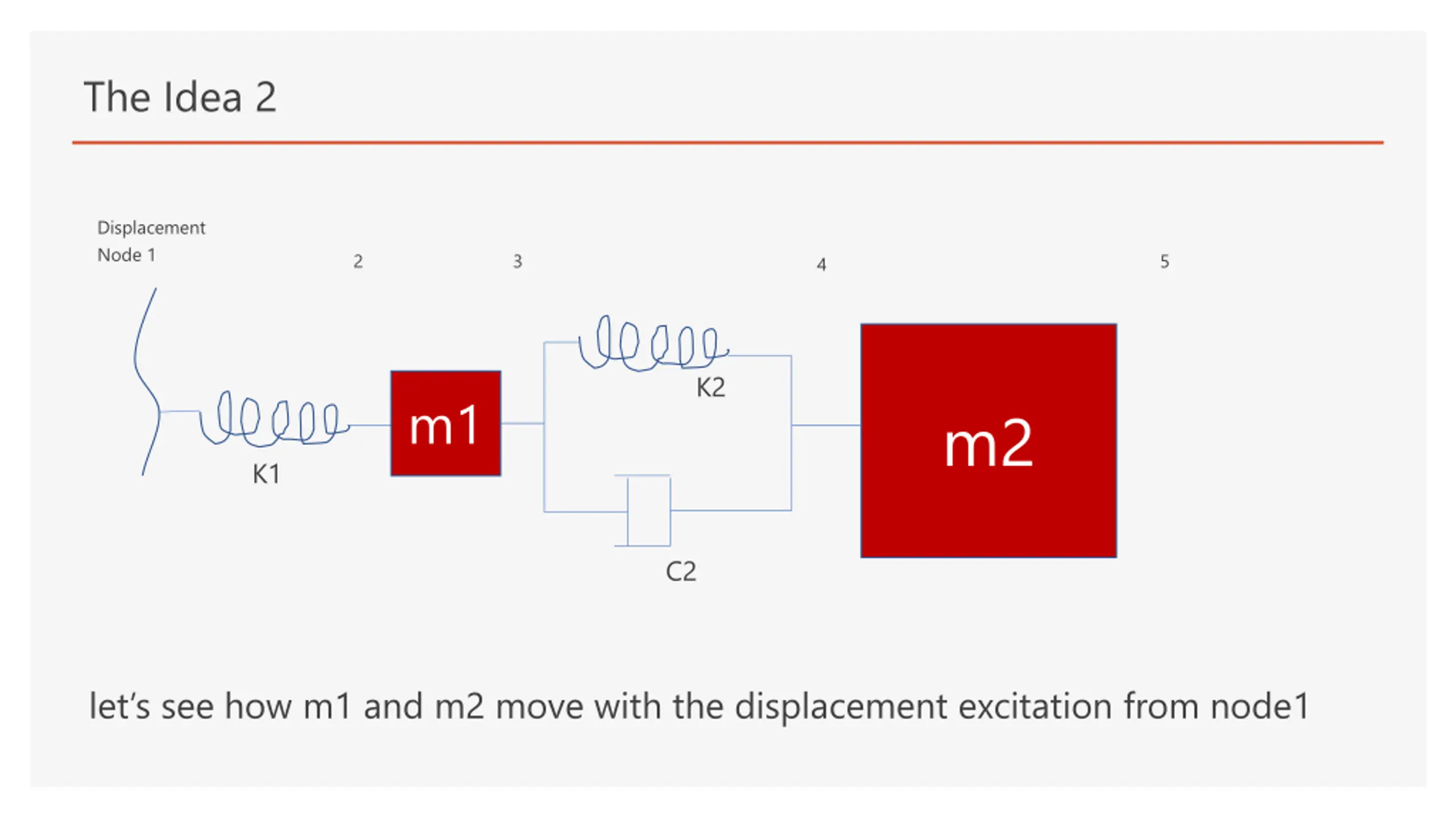 The Idea 2 Displacement Node 1 2 3 5 4 K2 m1 m2 K1 C2 let s see how m1 and m2 move with the displacement excitation from node1