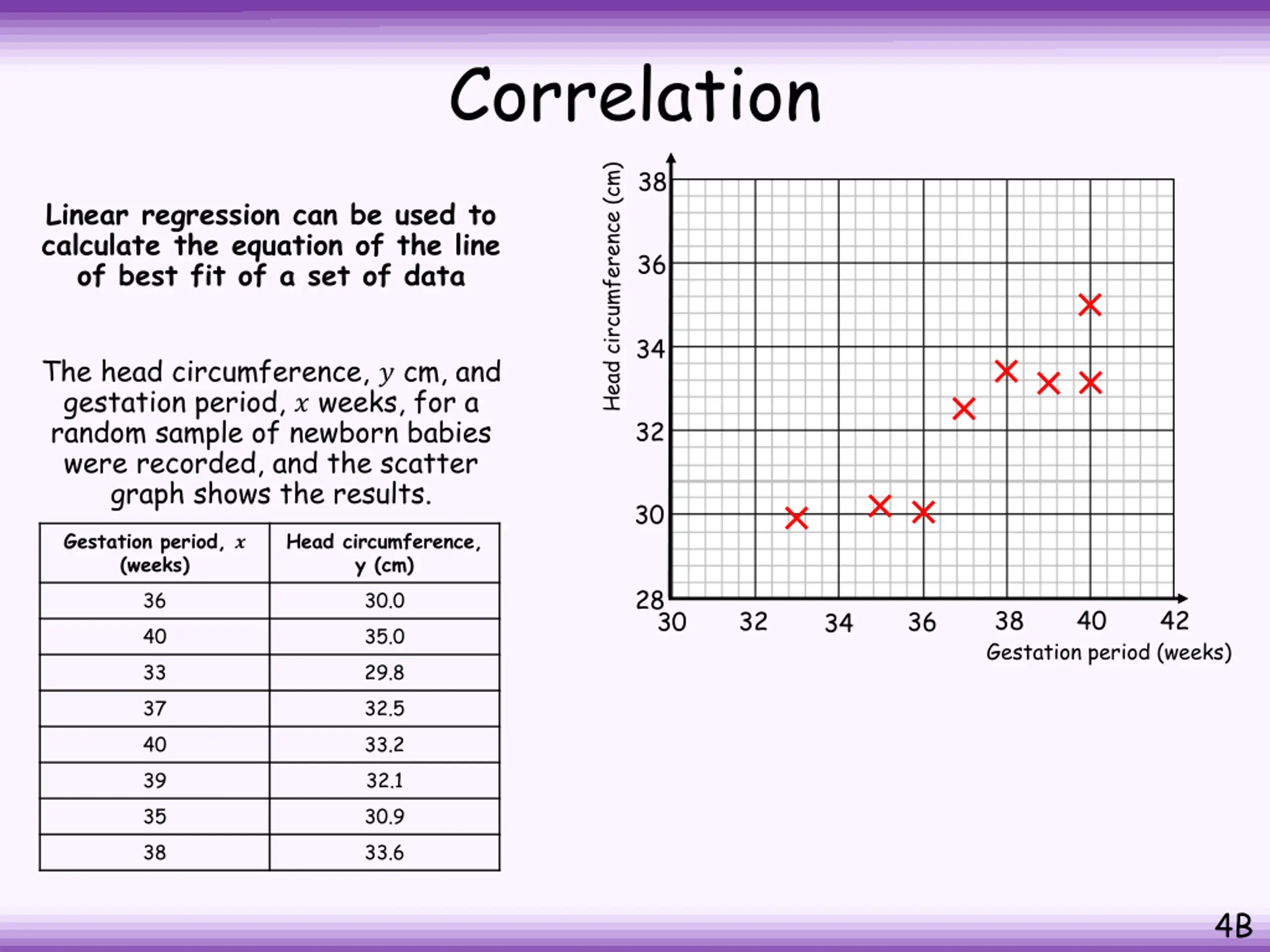 Correlation Head circumference (cm) 38 Linear regression can be used to calculate the equation of the line of best fit of a set of data 36 34 The head circumference, ? cm, and gestation period, ? weeks, for a random sample of newborn babies were recorded, and the scatter graph shows the results. 32 30 Gestation period, ? (weeks) 36 40 33 37 40 39 35 38 Head circumference, y (cm) 30.0 35.0 29.8 32.5 33.2 32.1 30.9 33.6 28 38 40 42 32 30 36 34 Gestation period (weeks) 4B
