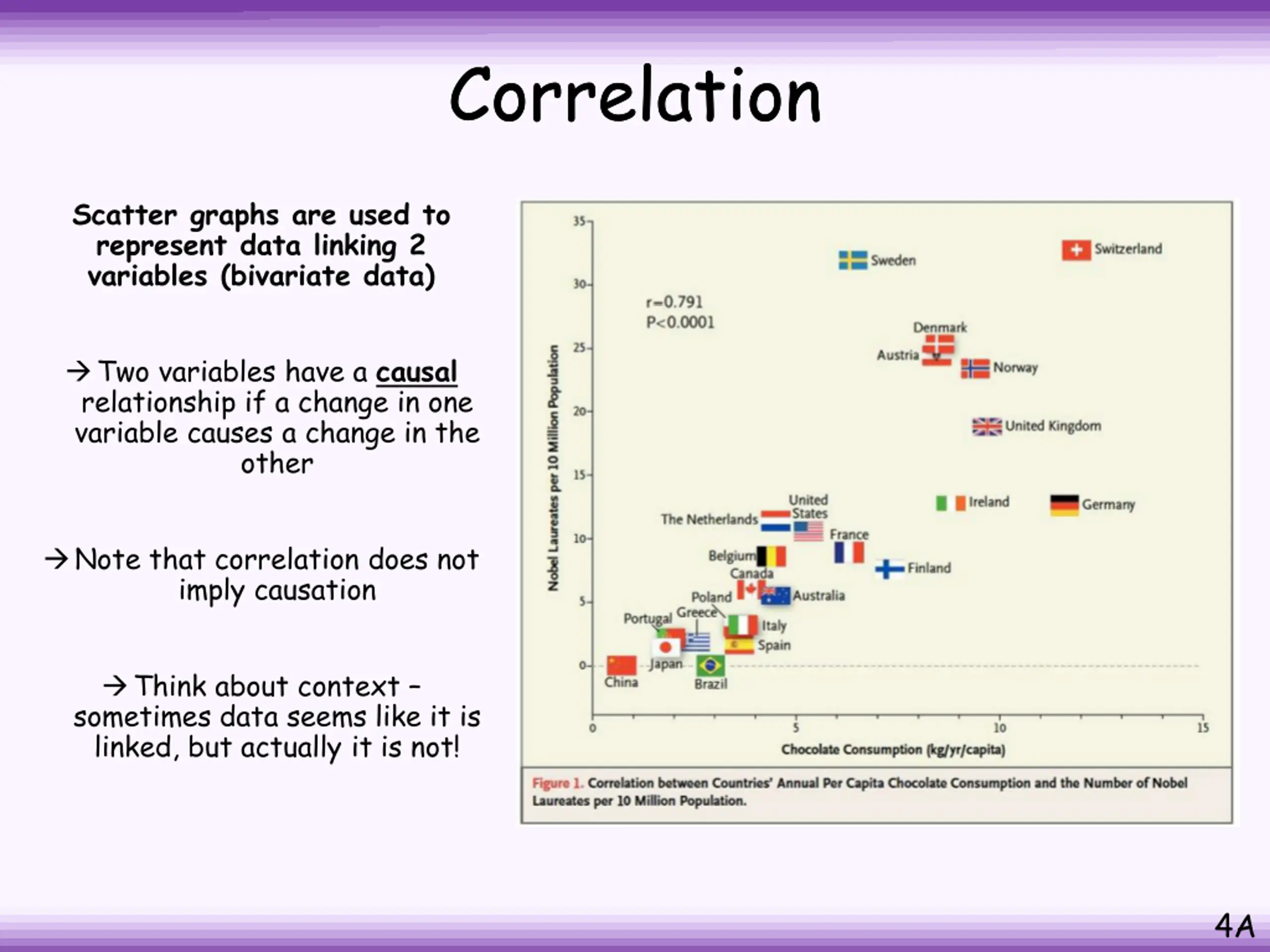Correlation Correlation Scatter graphs are used to represent data linking 2 variables (bivariate data) Two variables have a causal relationship if a change in one variable causes a change in the other Note that correlation does not imply causation Think about context sometimes data seems like it is linked, but actually it is not! 4A