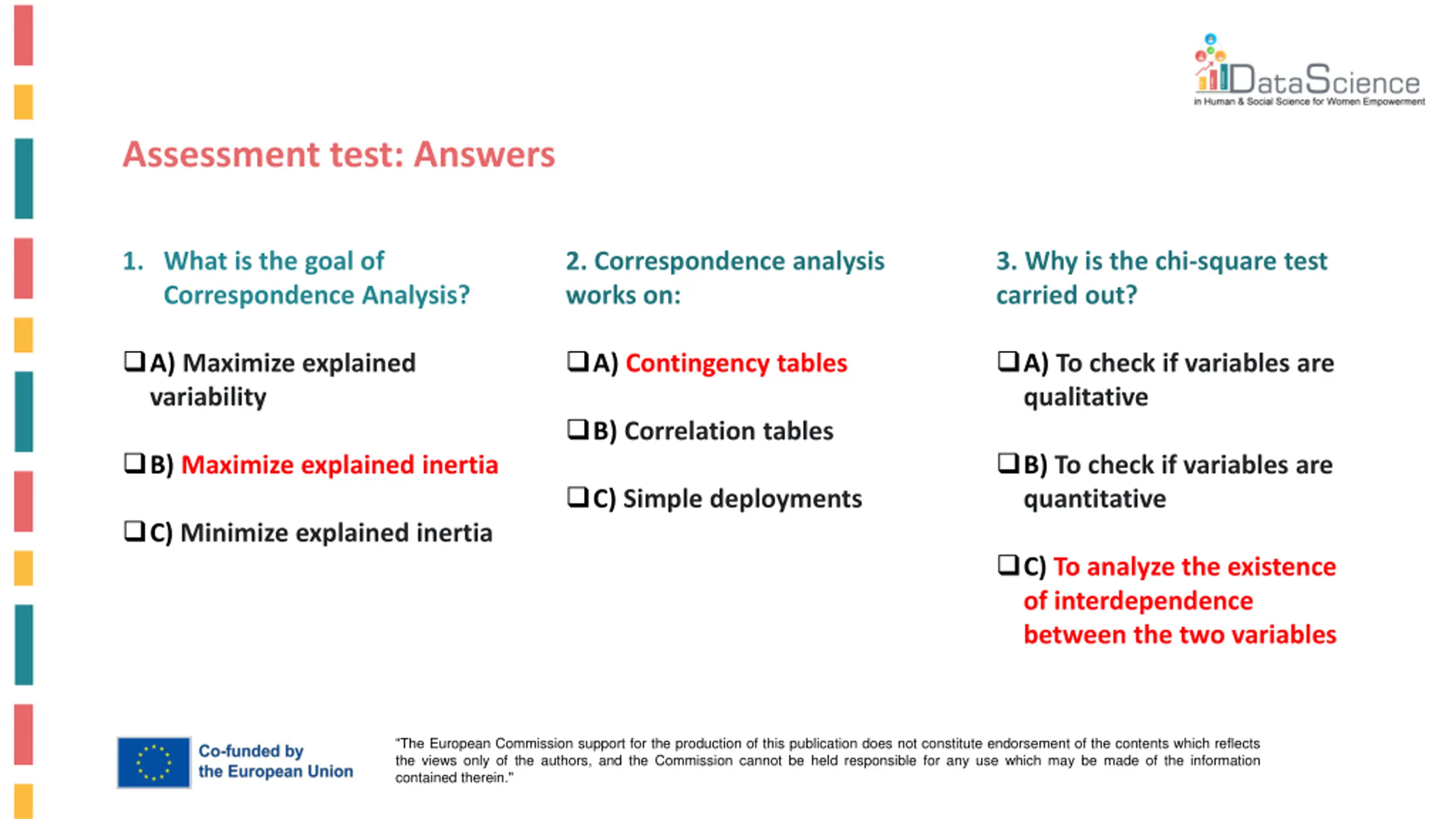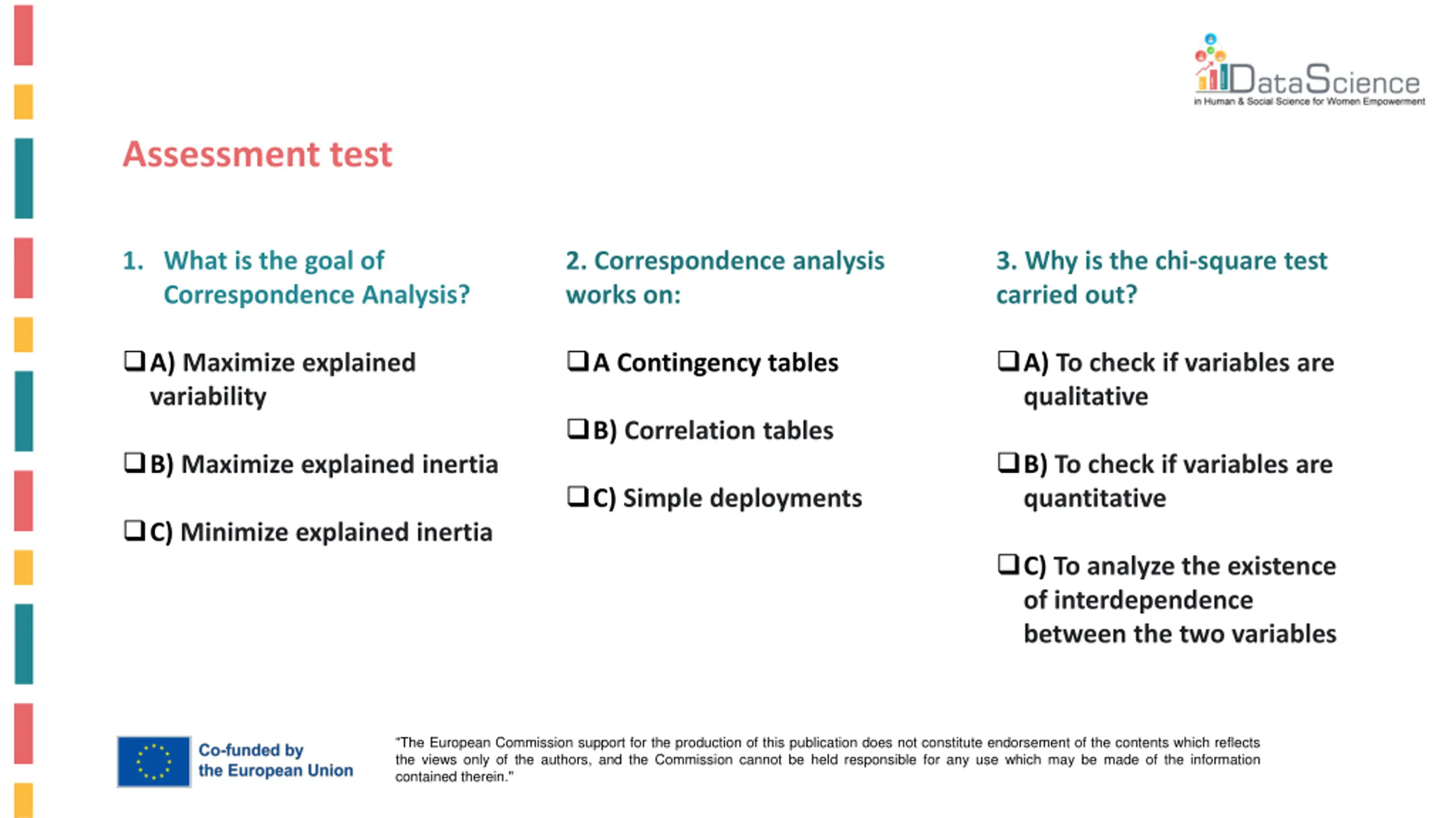 Assessment test 1. What is the goal of Correspondence Analysis? 2. Correspondence analysis works on: 3. Why is the chi-square test carried out? A) Maximize explained variability A Contingency tables A) To check if variables are qualitative B) Correlation tables B) Maximize explained inertia B) To check if variables are quantitative C) Simple deployments C) Minimize explained inertia C) To analyze the existence of interdependence between the two variables The European Commission support for the production of this publication does not constitute endorsement of the contents which reflects the views only of the authors, and the Commission cannot be held responsible for any use which may be made of the information contained therein."