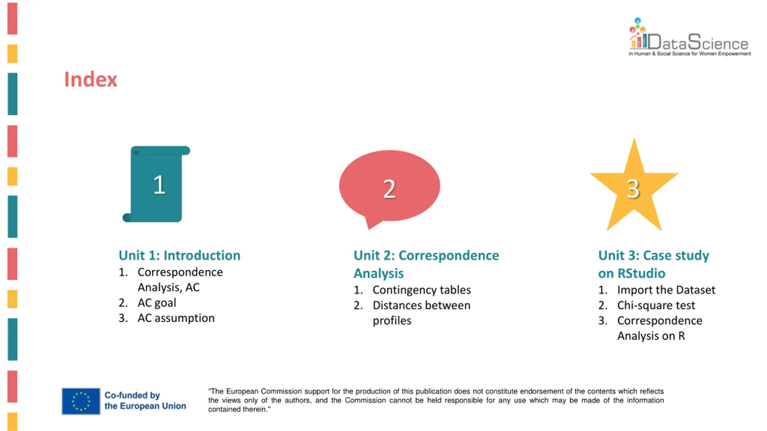 Index 1 3 2 Unit 1: Introduction 1. Correspondence Analysis, AC 2. AC goal 3. AC assumption Unit 2: Correspondence Analysis 1. Contingency tables 2. Distances between profiles Unit 3: Case study on RStudio 1. Import the Dataset 2. Chi-square test 3. Correspondence Analysis on R The European Commission support for the production of this publication does not constitute endorsement of the contents which reflects the views only of the authors, and the Commission cannot be held responsible for any use which may be made of the information contained therein."