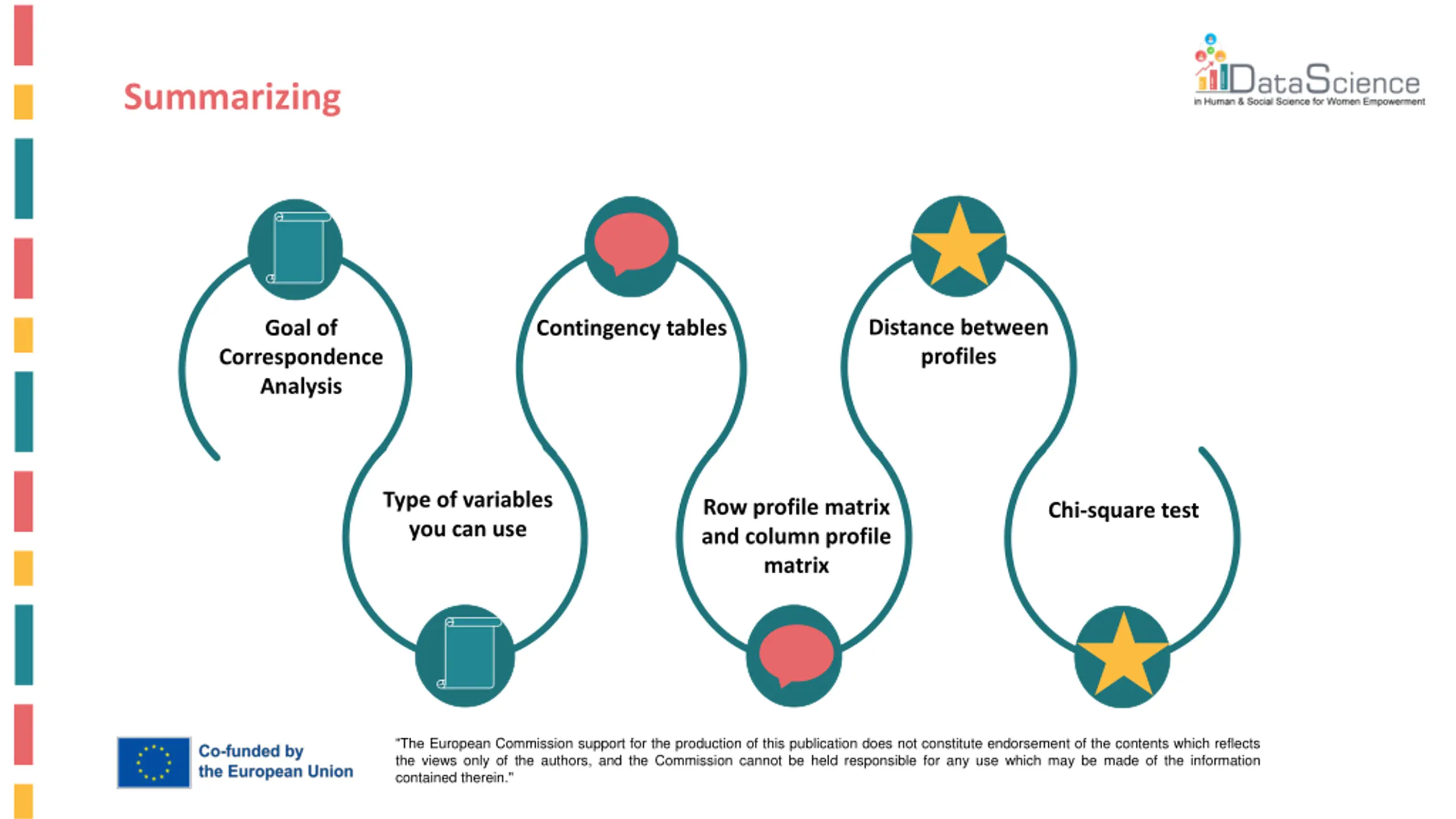 Summarizing Distance between profiles Goal of Contingency tables Correspondence Analysis Type of variables you can use Row profile matrix and column profile matrix Chi-square test The European Commission support for the production of this publication does not constitute endorsement of the contents which reflects the views only of the authors, and the Commission cannot be held responsible for any use which may be made of the information contained therein."