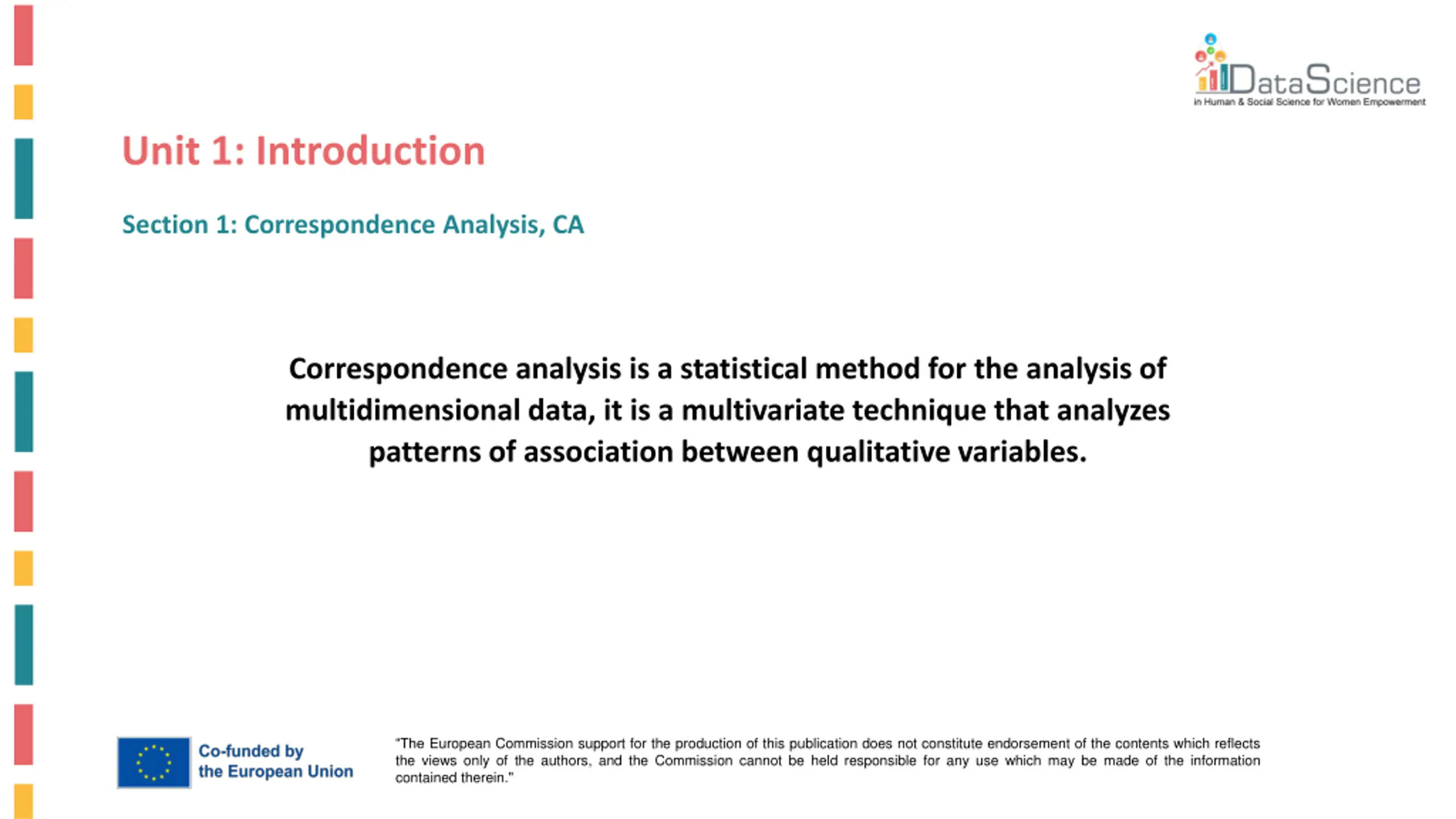 Unit 1: Introduction Section 1: Correspondence Analysis, CA Correspondence analysis is a statistical method for the analysis of multidimensional data, it is a multivariate technique that analyzes patterns of association between qualitative variables. The European Commission support for the production of this publication does not constitute endorsement of the contents which reflects the views only of the authors, and the Commission cannot be held responsible for any use which may be made of the information contained therein."
