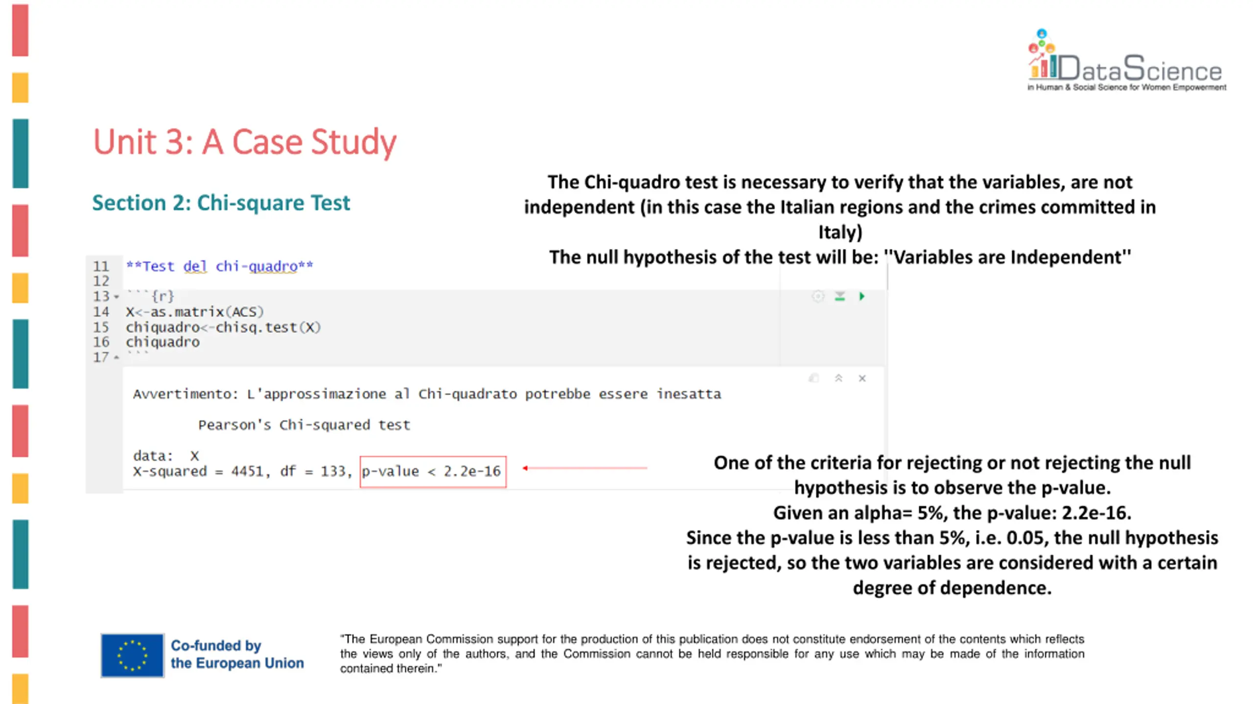 Unit 3: A Case Study Unit 3: A Case Study The Chi-quadro test is necessary to verify that the variables, are not independent (in this case the Italian regions and the crimes committed in Italy) The null hypothesis of the test will be: ''Variables are Independent'' Section 2: Chi-square Test One of the criteria for rejecting or not rejecting the null hypothesis is to observe the p-value. Given an alpha= 5%, the p-value: 2.2e-16. Since the p-value is less than 5%, i.e. 0.05, the null hypothesis is rejected, so the two variables are considered with a certain degree of dependence. The European Commission support for the production of this publication does not constitute endorsement of the contents which reflects the views only of the authors, and the Commission cannot be held responsible for any use which may be made of the information contained therein."