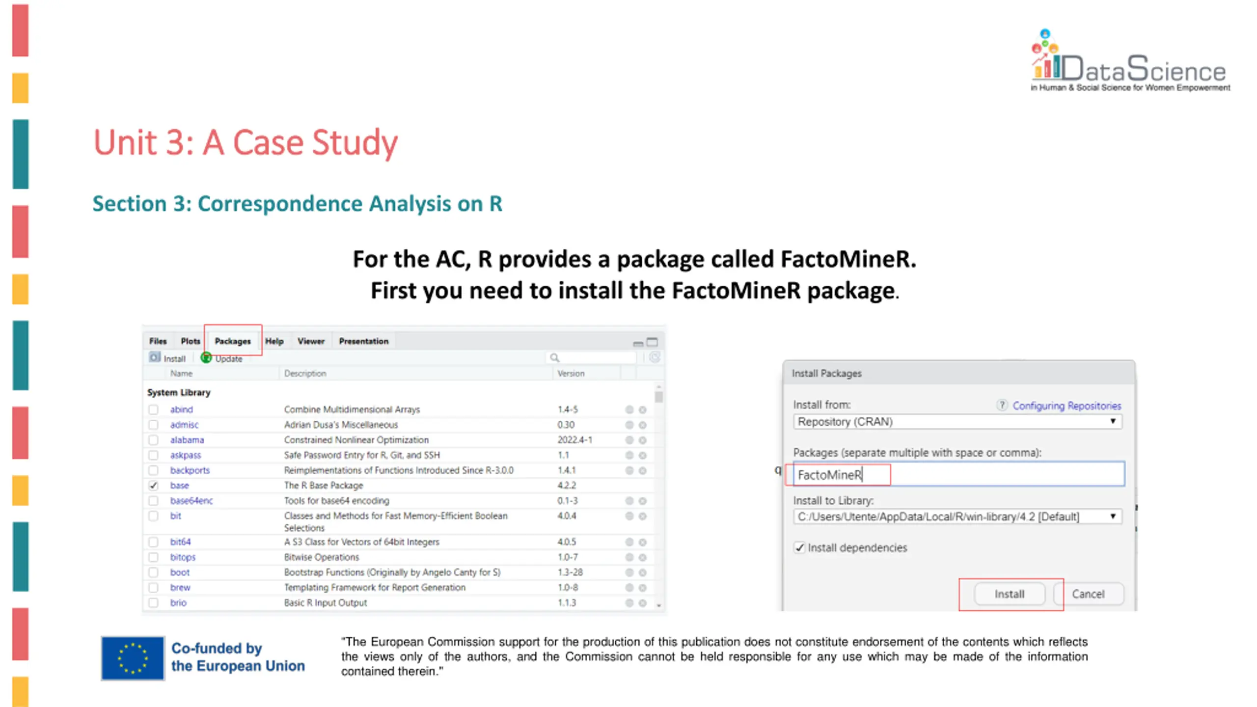 Unit 3: A Case Study Unit 3: A Case Study Section 3: Correspondence Analysis on R For the AC, R provides a package called FactoMineR. First you need to install the FactoMineR package. The European Commission support for the production of this publication does not constitute endorsement of the contents which reflects the views only of the authors, and the Commission cannot be held responsible for any use which may be made of the information contained therein."