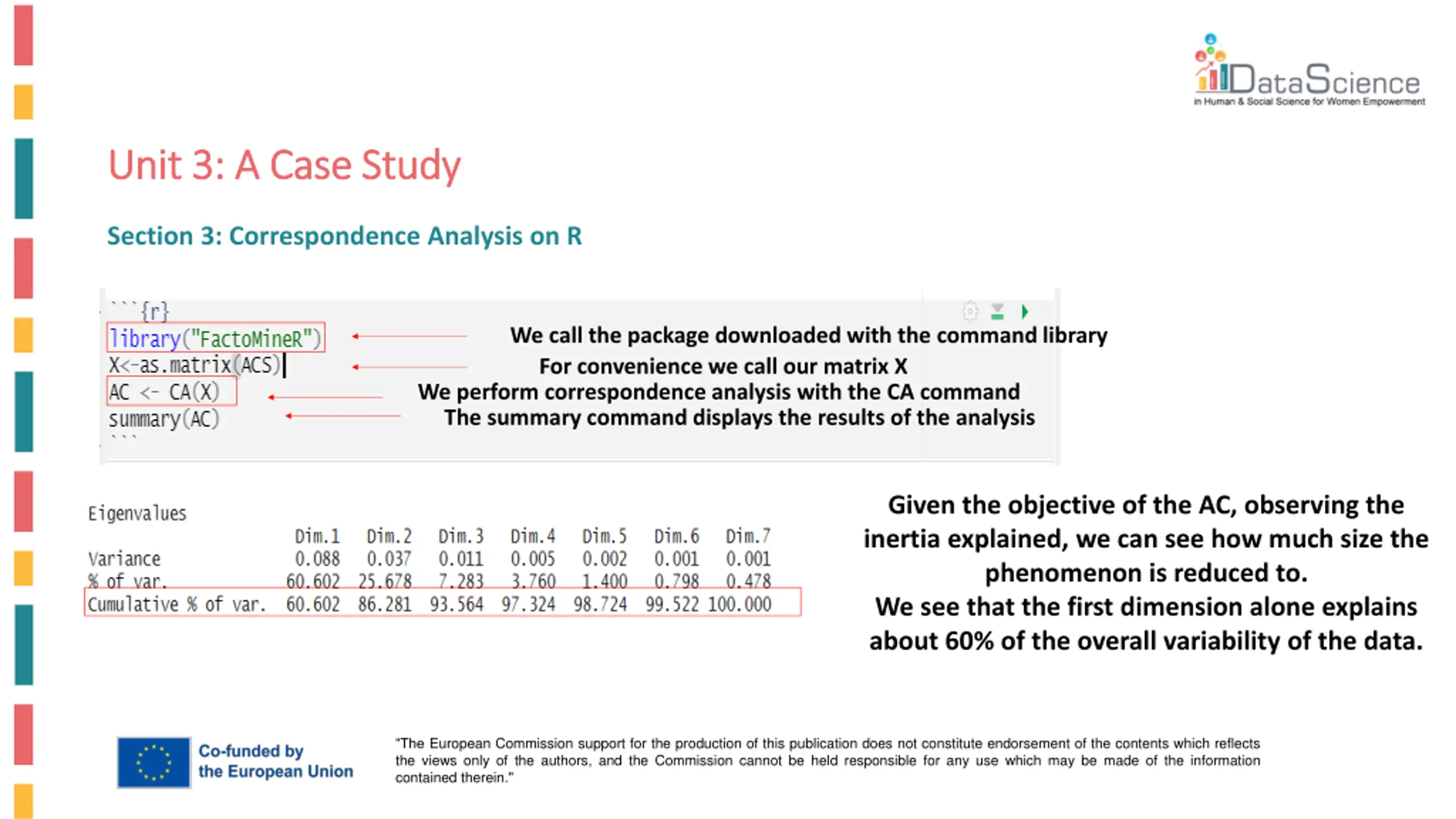 Unit 3: A Case Study Unit 3: A Case Study Section 3: Correspondence Analysis on R We call the package downloaded with the command library For convenience we call our matrix X We perform correspondence analysis with the CA command The summary command displays the results of the analysis Given the objective of the AC, observing the inertia explained, we can see how much size the phenomenon is reduced to. We see that the first dimension alone explains about 60% of the overall variability of the data. The European Commission support for the production of this publication does not constitute endorsement of the contents which reflects the views only of the authors, and the Commission cannot be held responsible for any use which may be made of the information contained therein."