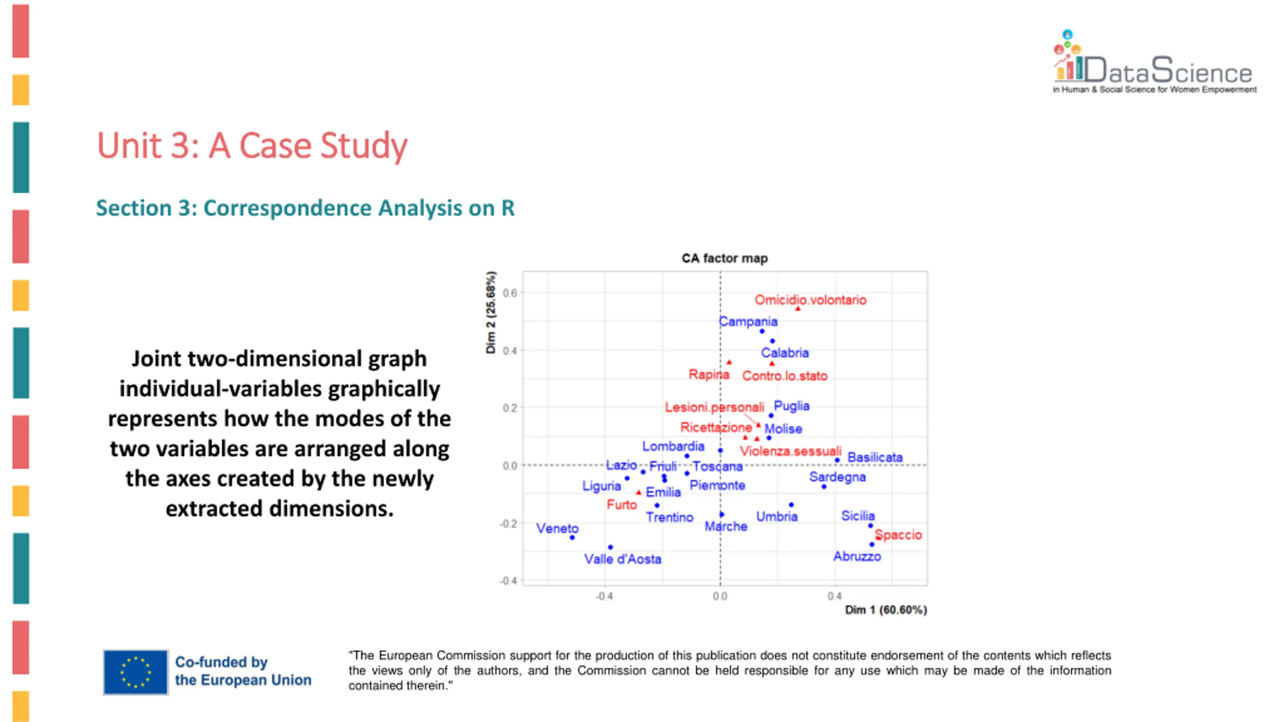 Unit 3: A Case Study Unit 3: A Case Study Section 3: Correspondence Analysis on R Joint two-dimensional graph individual-variables graphically represents how the modes of the two variables are arranged along the axes created by the newly extracted dimensions. The European Commission support for the production of this publication does not constitute endorsement of the contents which reflects the views only of the authors, and the Commission cannot be held responsible for any use which may be made of the information contained therein."