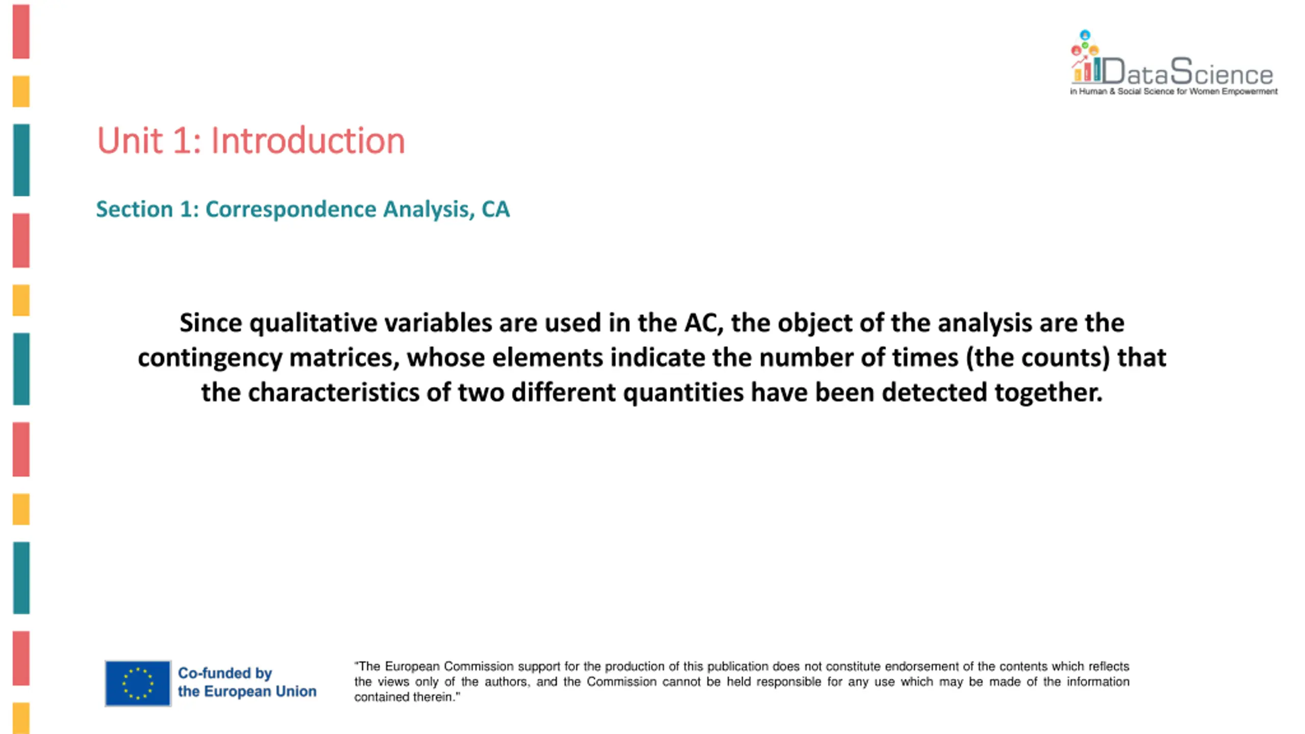 Unit Unit 1: 1: Introduction Introduction Section 1: Correspondence Analysis, CA Since qualitative variables are used in the AC, the object of the analysis are the contingency matrices, whose elements indicate the number of times (the counts) that the characteristics of two different quantities have been detected together. The European Commission support for the production of this publication does not constitute endorsement of the contents which reflects the views only of the authors, and the Commission cannot be held responsible for any use which may be made of the information contained therein."