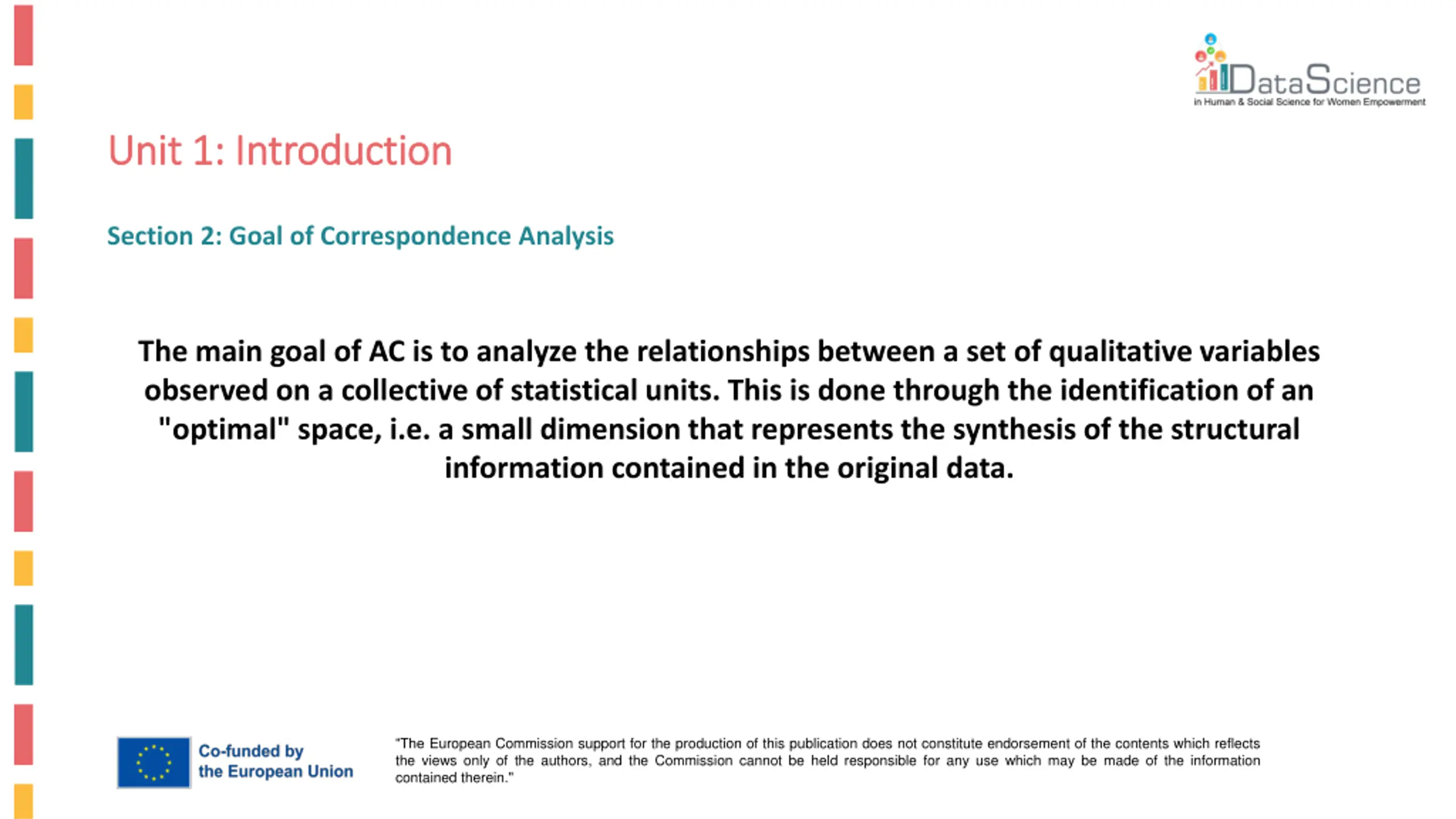 Unit Unit 1: 1: Introduction Introduction Section 2: Goal of Correspondence Analysis The main goal of AC is to analyze the relationships between a set of qualitative variables observed on a collective of statistical units. This is done through the identification of an "optimal" space, i.e. a small dimension that represents the synthesis of the structural information contained in the original data. The European Commission support for the production of this publication does not constitute endorsement of the contents which reflects the views only of the authors, and the Commission cannot be held responsible for any use which may be made of the information contained therein."