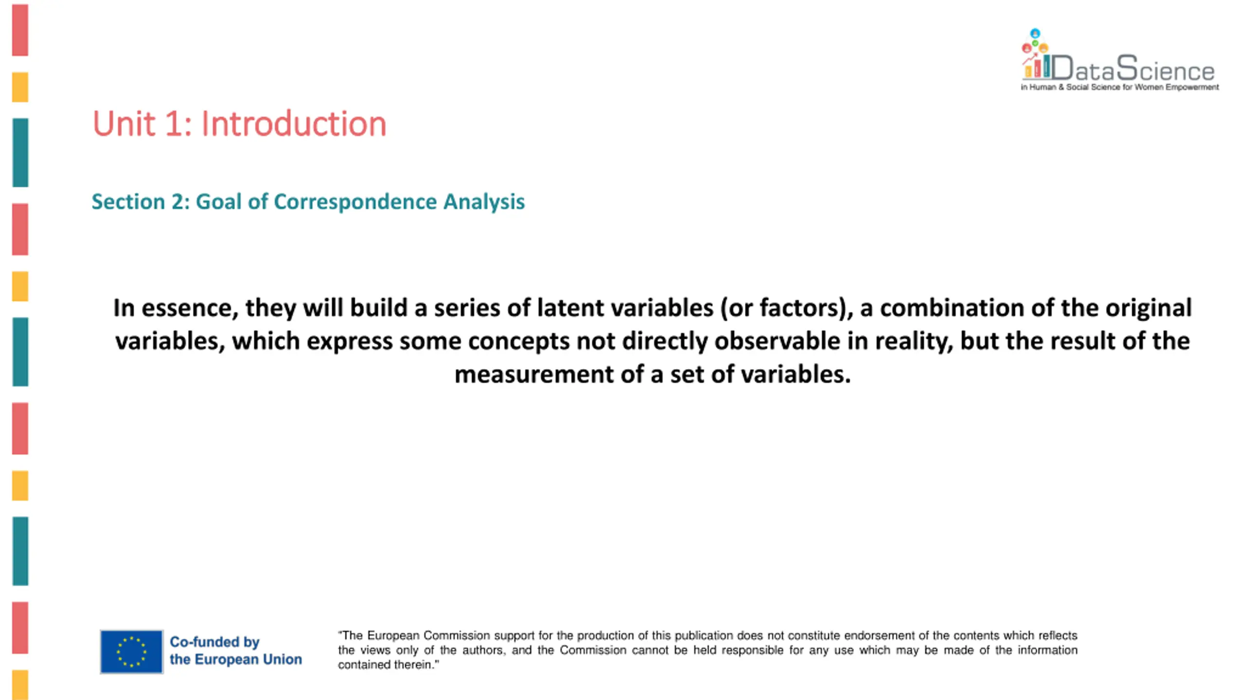 Unit Unit 1: 1: Introduction Introduction Section 2: Goal of Correspondence Analysis In essence, they will build a series of latent variables (or factors), a combination of the original variables, which express some concepts not directly observable in reality, but the result of the measurement of a set of variables. The European Commission support for the production of this publication does not constitute endorsement of the contents which reflects the views only of the authors, and the Commission cannot be held responsible for any use which may be made of the information contained therein."