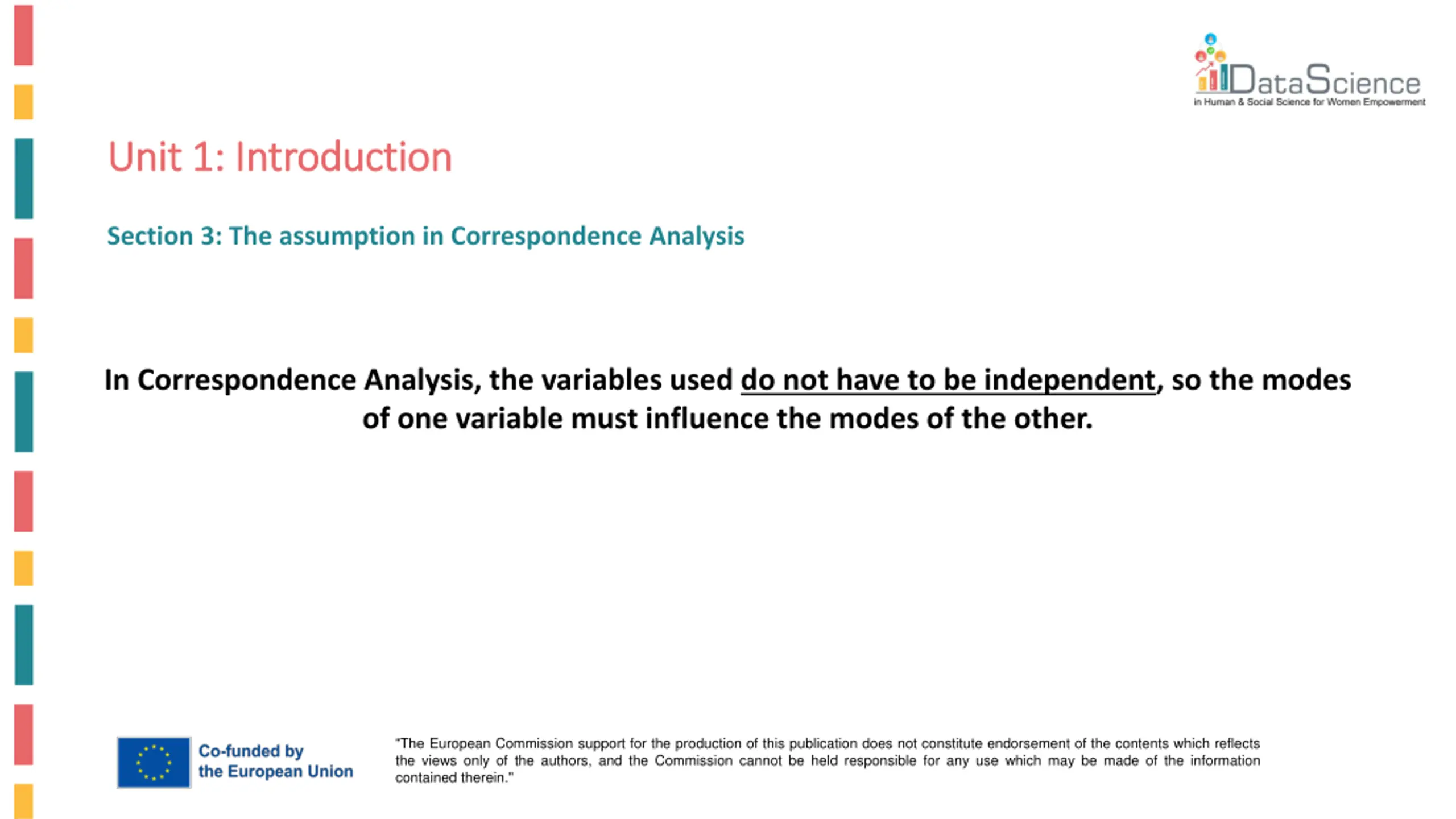 Unit Unit 1: 1: Introduction Introduction Section 3: The assumption in Correspondence Analysis In Correspondence Analysis, the variables used do not have to be independent, so the modes of one variable must influence the modes of the other. The European Commission support for the production of this publication does not constitute endorsement of the contents which reflects the views only of the authors, and the Commission cannot be held responsible for any use which may be made of the information contained therein."