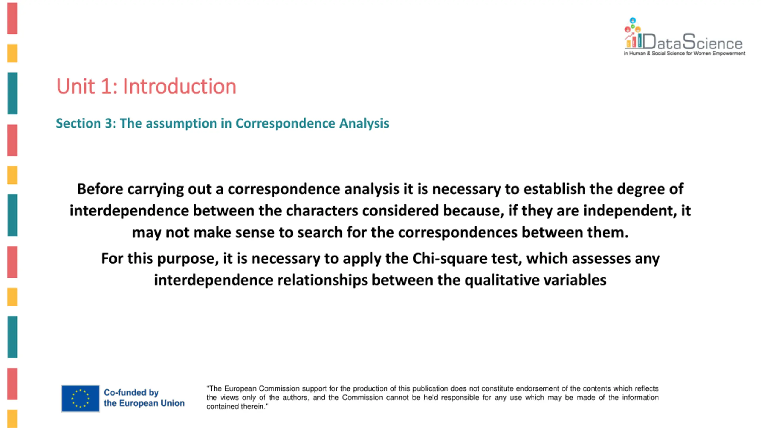Unit Unit 1: 1: Introduction Introduction Section 3: The assumption in Correspondence Analysis Before carrying out a correspondence analysis it is necessary to establish the degree of interdependence between the characters considered because, if they are independent, it may not make sense to search for the correspondences between them. For this purpose, it is necessary to apply the Chi-square test, which assesses any interdependence relationships between the qualitative variables The European Commission support for the production of this publication does not constitute endorsement of the contents which reflects the views only of the authors, and the Commission cannot be held responsible for any use which may be made of the information contained therein."