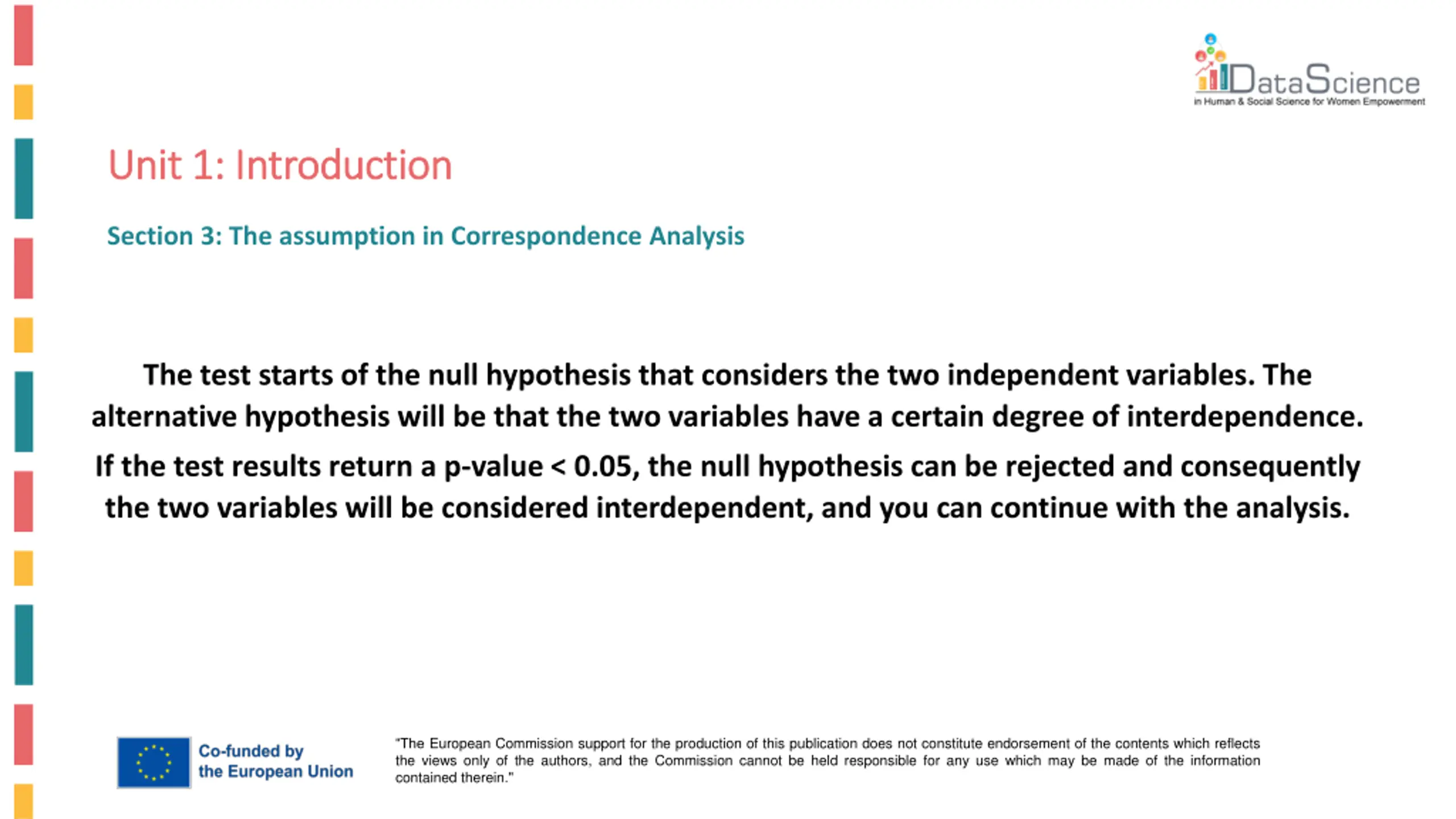 Unit Unit 1: 1: Introduction Introduction Section 3: The assumption in Correspondence Analysis The test starts of the null hypothesis that considers the two independent variables. The alternative hypothesis will be that the two variables have a certain degree of interdependence. If the test results return a p-value < 0.05, the null hypothesis can be rejected and consequently the two variables will be considered interdependent, and you can continue with the analysis. The European Commission support for the production of this publication does not constitute endorsement of the contents which reflects the views only of the authors, and the Commission cannot be held responsible for any use which may be made of the information contained therein."