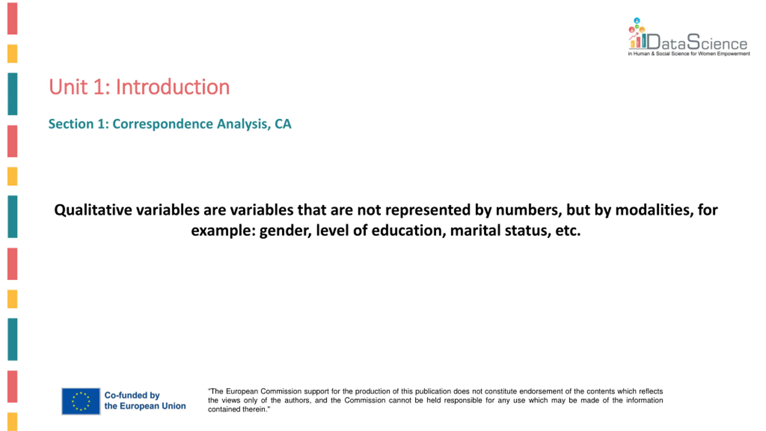 Unit Unit 1: 1: Introduction Introduction Section 1: Correspondence Analysis, CA Qualitative variables are variables that are not represented by numbers, but by modalities, for example: gender, level of education, marital status, etc. The European Commission support for the production of this publication does not constitute endorsement of the contents which reflects the views only of the authors, and the Commission cannot be held responsible for any use which may be made of the information contained therein."