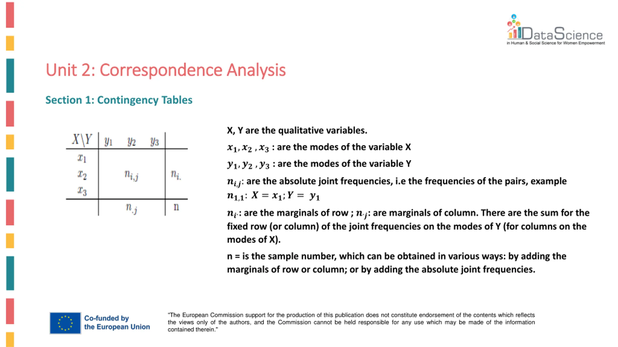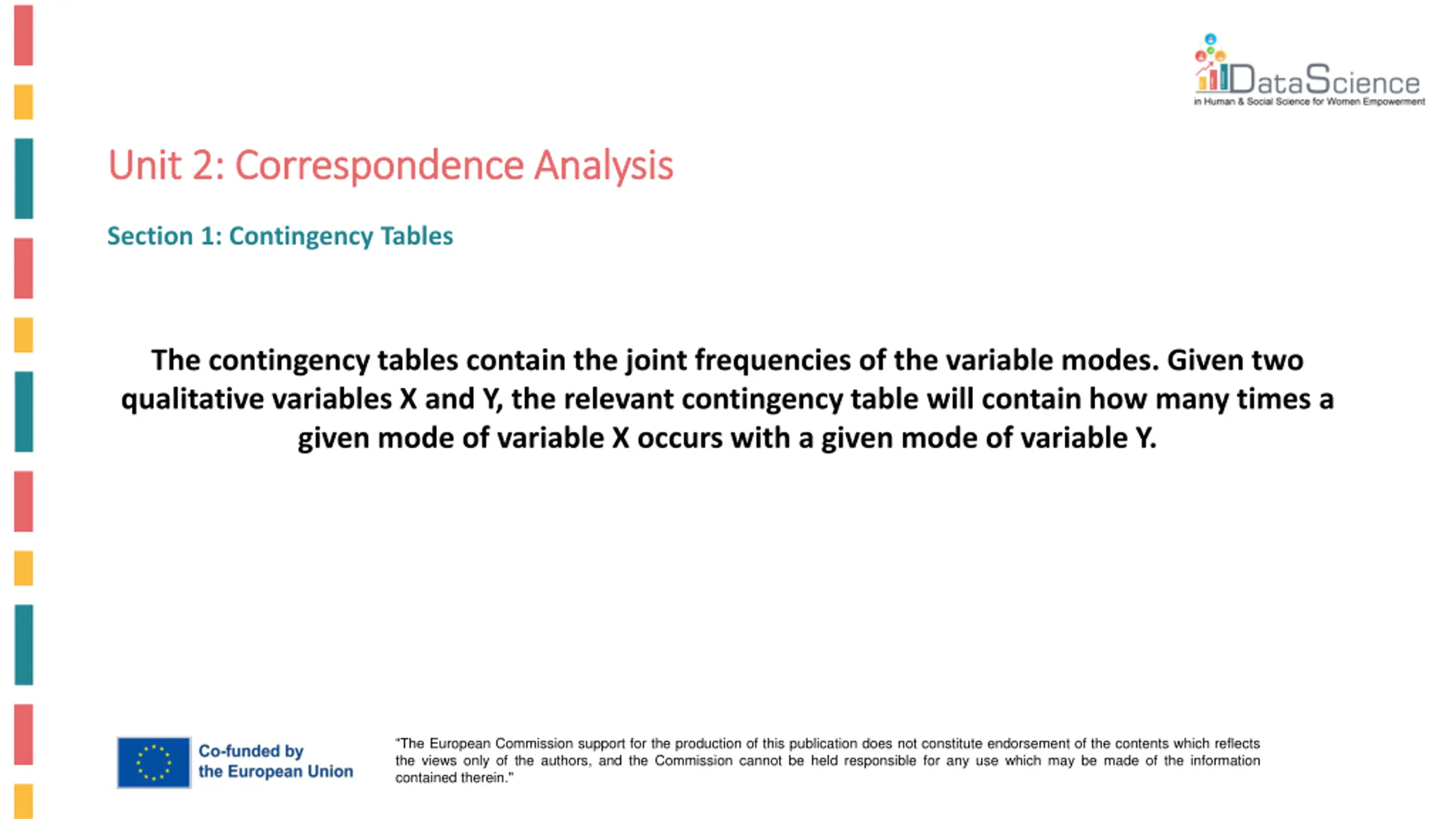 Unit Unit 2: 2: Correspondence Correspondence Analysis Analysis Section 1: Contingency Tables The contingency tables contain the joint frequencies of the variable modes. Given two qualitative variables X and Y, the relevant contingency table will contain how many times a given mode of variable X occurs with a given mode of variable Y. The European Commission support for the production of this publication does not constitute endorsement of the contents which reflects the views only of the authors, and the Commission cannot be held responsible for any use which may be made of the information contained therein."