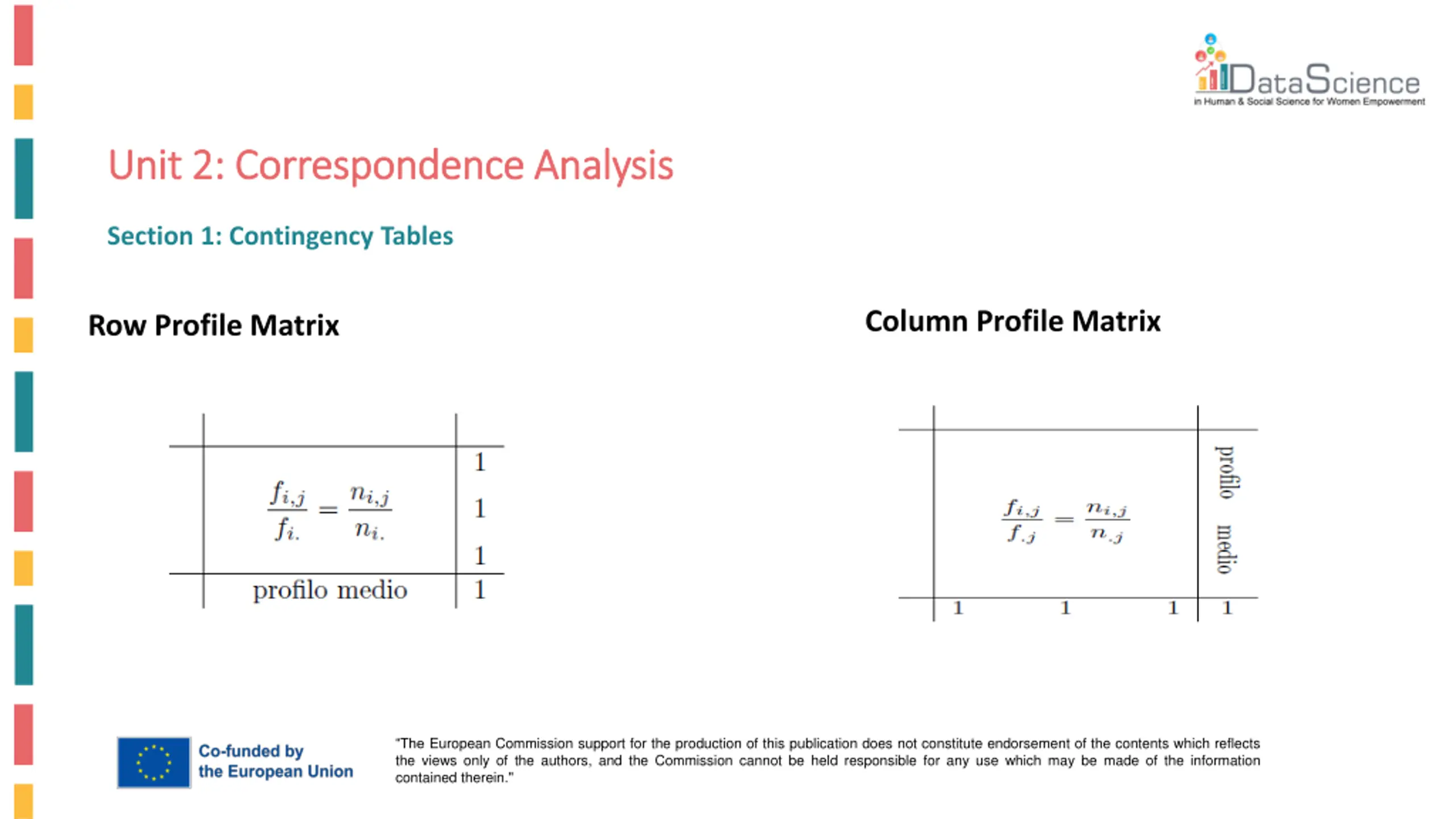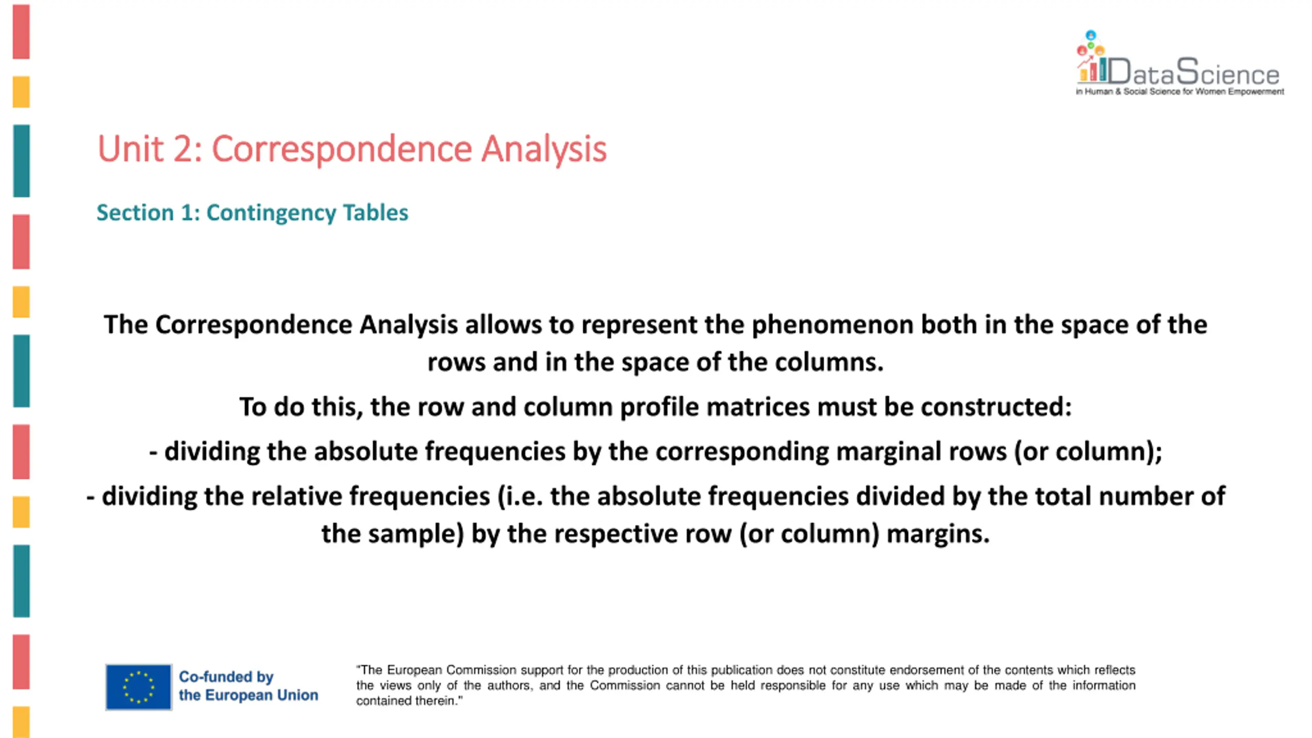 Unit Unit 2: 2: Correspondence Correspondence Analysis Analysis Section 1: Contingency Tables The Correspondence Analysis allows to represent the phenomenon both in the space of the rows and in the space of the columns. To do this, the row and column profile matrices must be constructed: - dividing the absolute frequencies by the corresponding marginal rows (or column); - dividing the relative frequencies (i.e. the absolute frequencies divided by the total number of the sample) by the respective row (or column) margins. The European Commission support for the production of this publication does not constitute endorsement of the contents which reflects the views only of the authors, and the Commission cannot be held responsible for any use which may be made of the information contained therein."