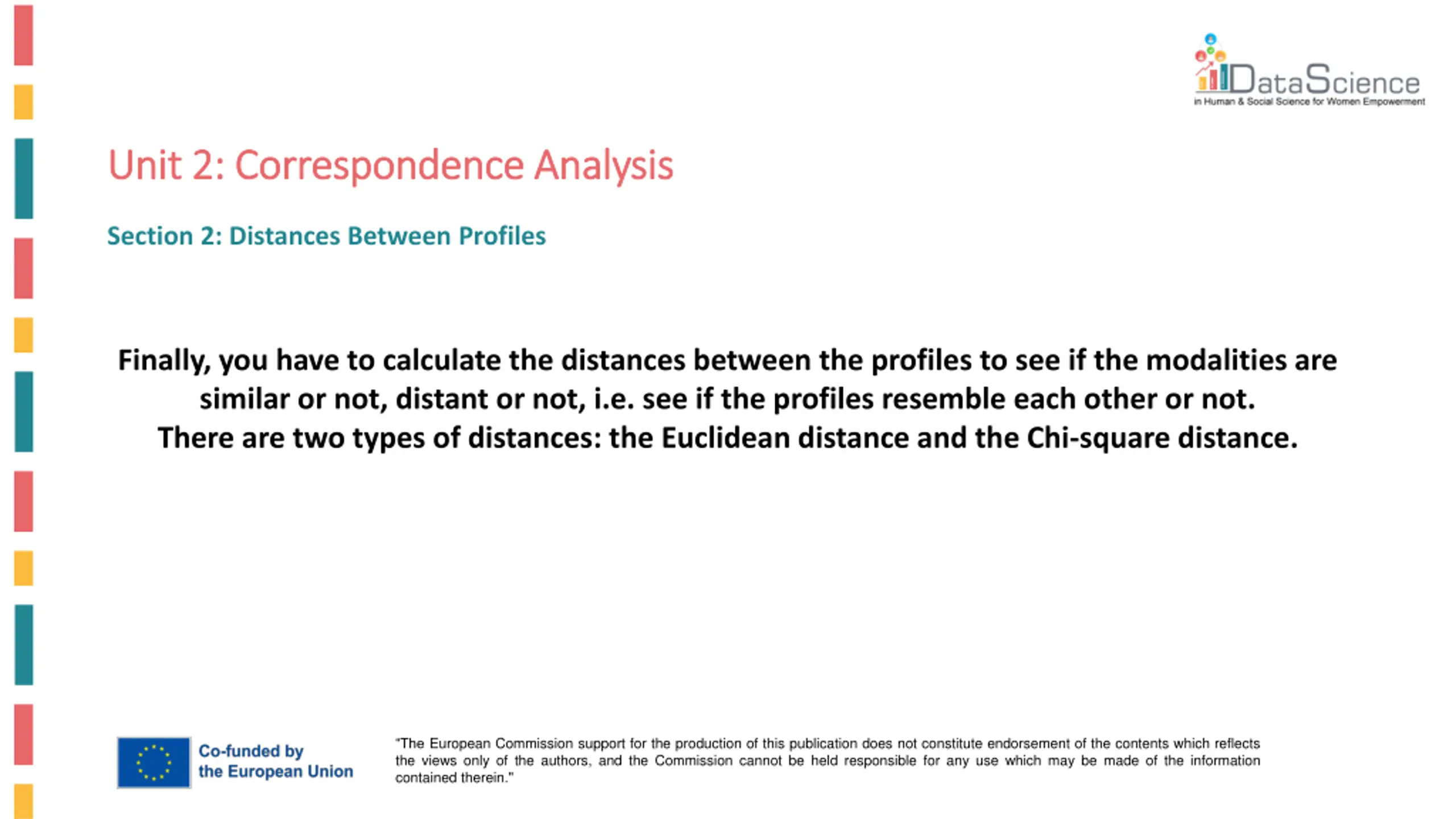 Unit Unit 2: 2: Correspondence Correspondence Analysis Analysis Section 2: Distances Between Profiles Finally, you have to calculate the distances between the profiles to see if the modalities are similar or not, distant or not, i.e. see if the profiles resemble each other or not. There are two types of distances: the Euclidean distance and the Chi-square distance. The European Commission support for the production of this publication does not constitute endorsement of the contents which reflects the views only of the authors, and the Commission cannot be held responsible for any use which may be made of the information contained therein."