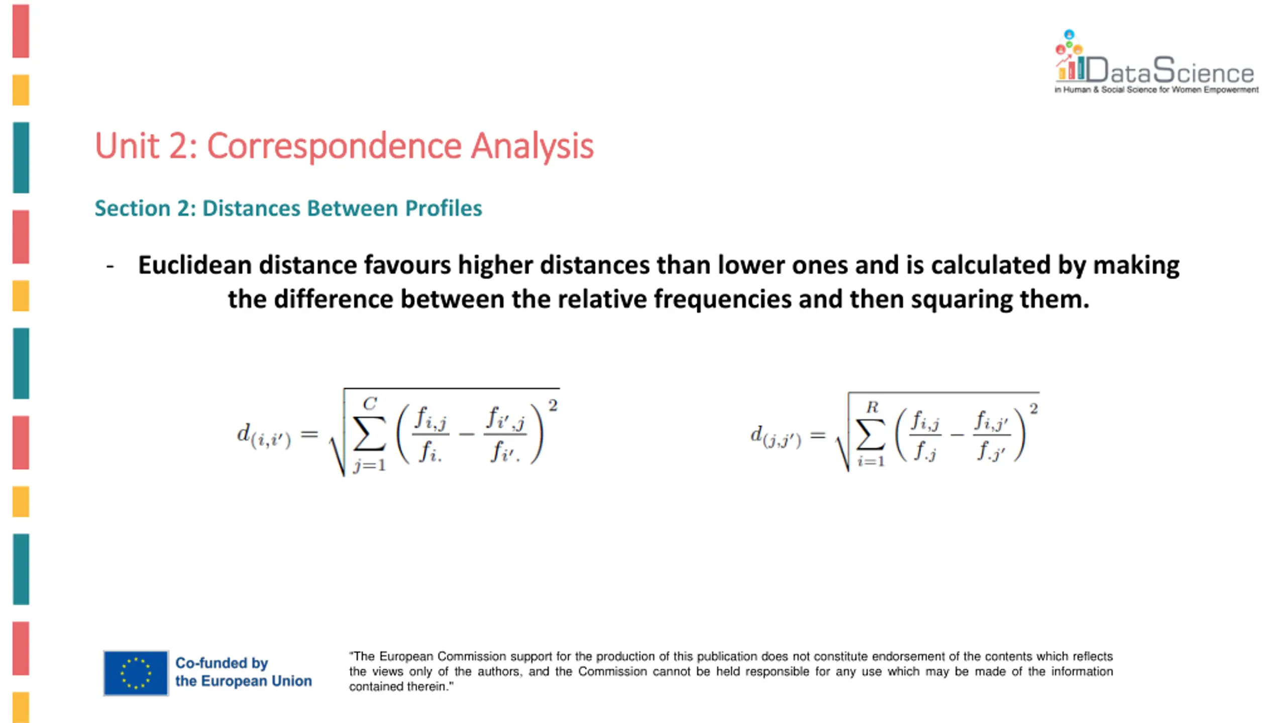 Unit Unit 2: 2: Correspondence Correspondence Analysis Analysis Section 2: Distances Between Profiles - Euclidean distance favours higher distances than lower ones and is calculated by making the difference between the relative frequencies and then squaring them. The European Commission support for the production of this publication does not constitute endorsement of the contents which reflects the views only of the authors, and the Commission cannot be held responsible for any use which may be made of the information contained therein."