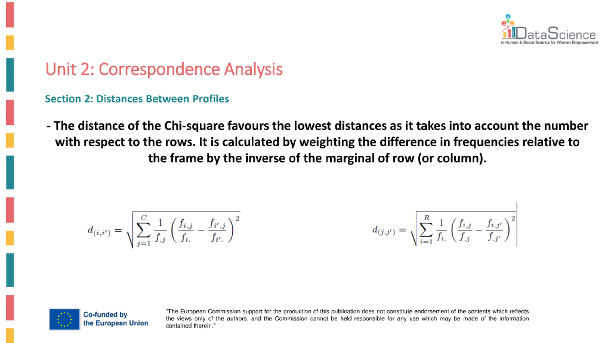 Unit Unit 2: 2: Correspondence Correspondence Analysis Analysis Section 2: Distances Between Profiles - The distance of the Chi-square favours the lowest distances as it takes into account the number with respect to the rows. It is calculated by weighting the difference in frequencies relative to the frame by the inverse of the marginal of row (or column). The European Commission support for the production of this publication does not constitute endorsement of the contents which reflects the views only of the authors, and the Commission cannot be held responsible for any use which may be made of the information contained therein."