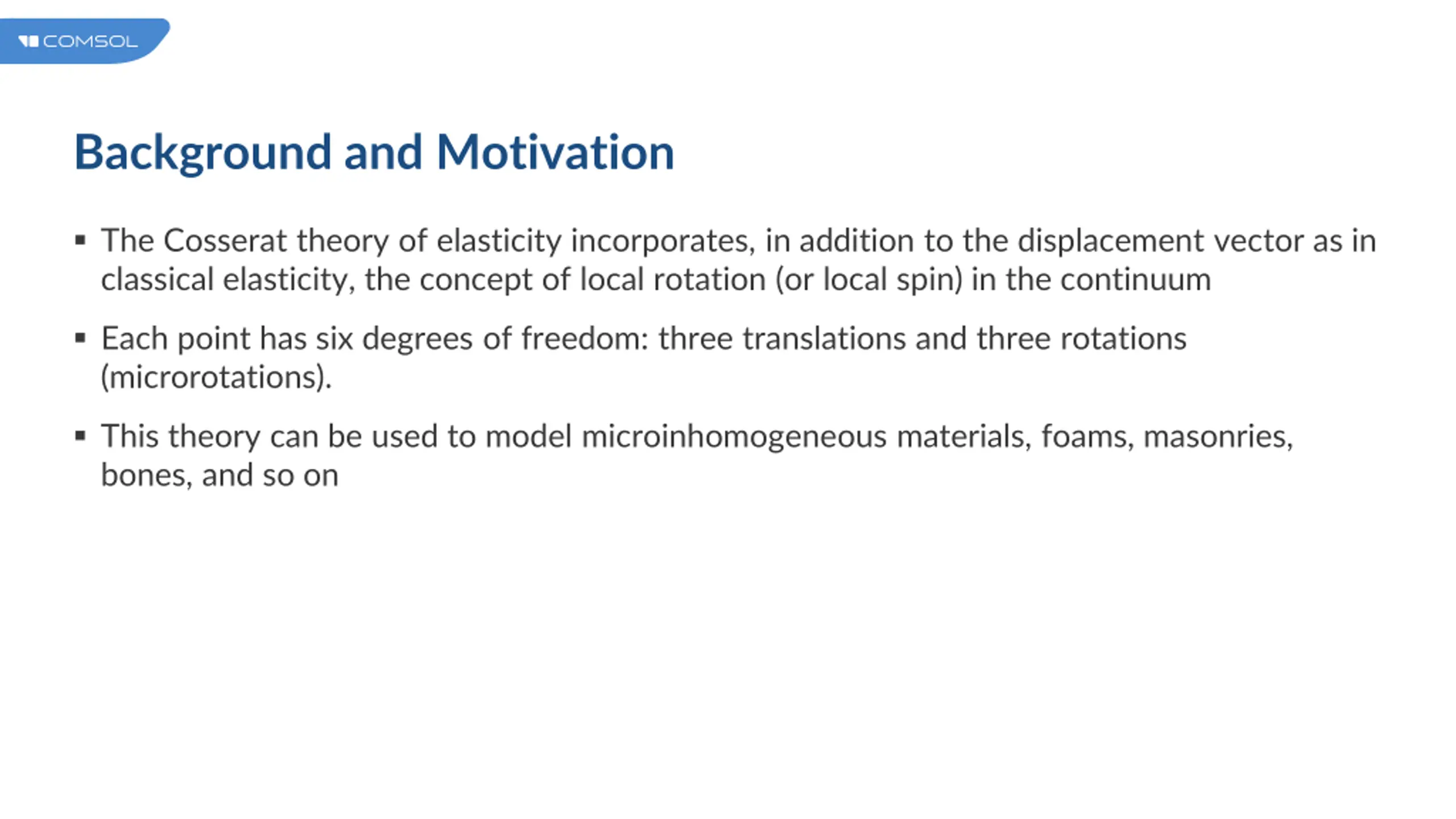 Background and Motivation The Cosserat theory of elasticity incorporates, in addition to the displacement vector as in classical elasticity, the concept of local rotation (or local spin) in the continuum Each point has six degrees of freedom: three translations and three rotations (microrotations). This theory can be used to model microinhomogeneous materials, foams, masonries, bones, and so on