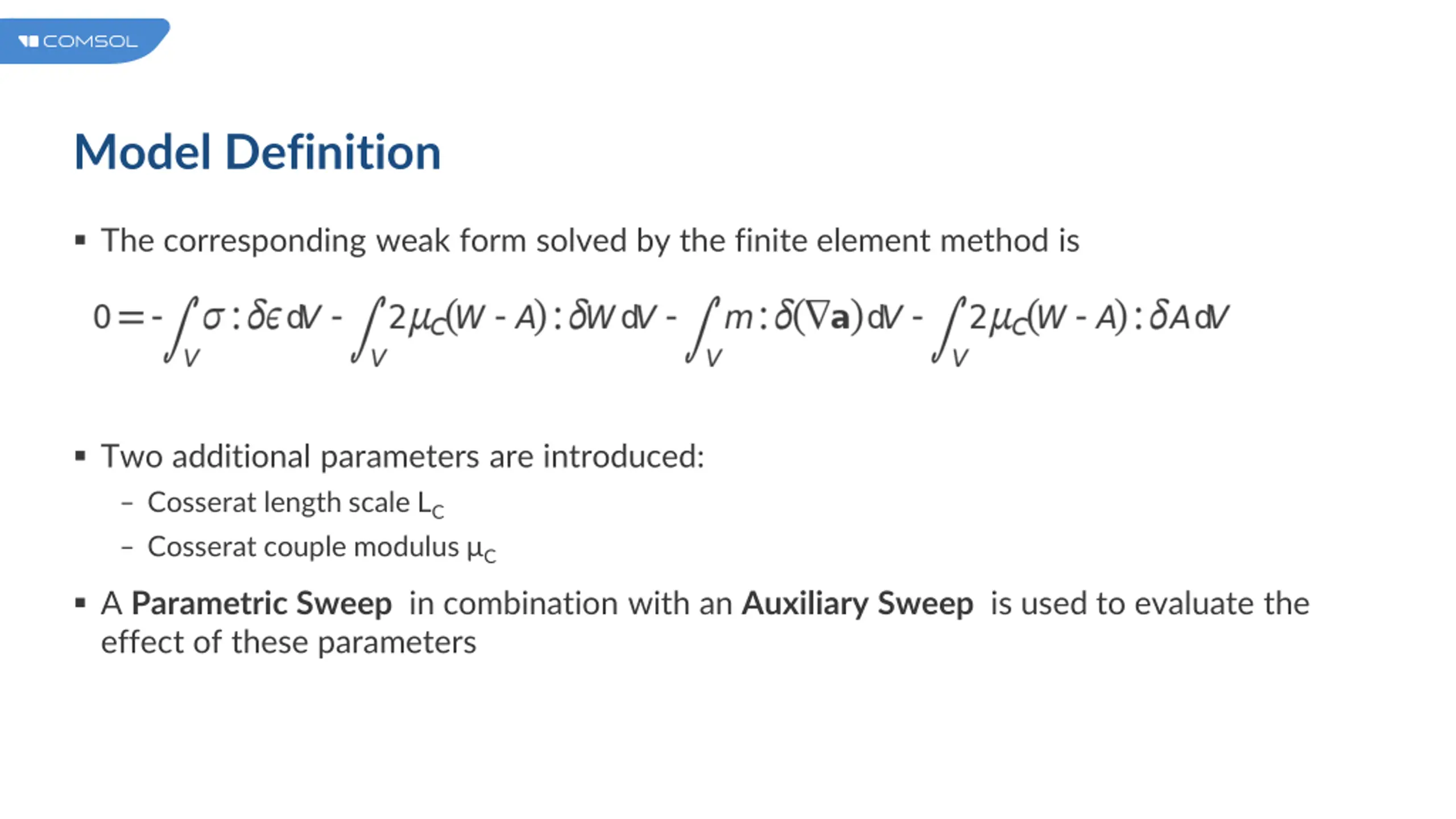 Model Definition The corresponding weak form solved by the finite element method is Two additional parameters are introduced: Cosserat length scale LC Cosserat couple modulus C A Parametric Sweep in combination with an Auxiliary Sweep is used to evaluate the effect of these parameters
