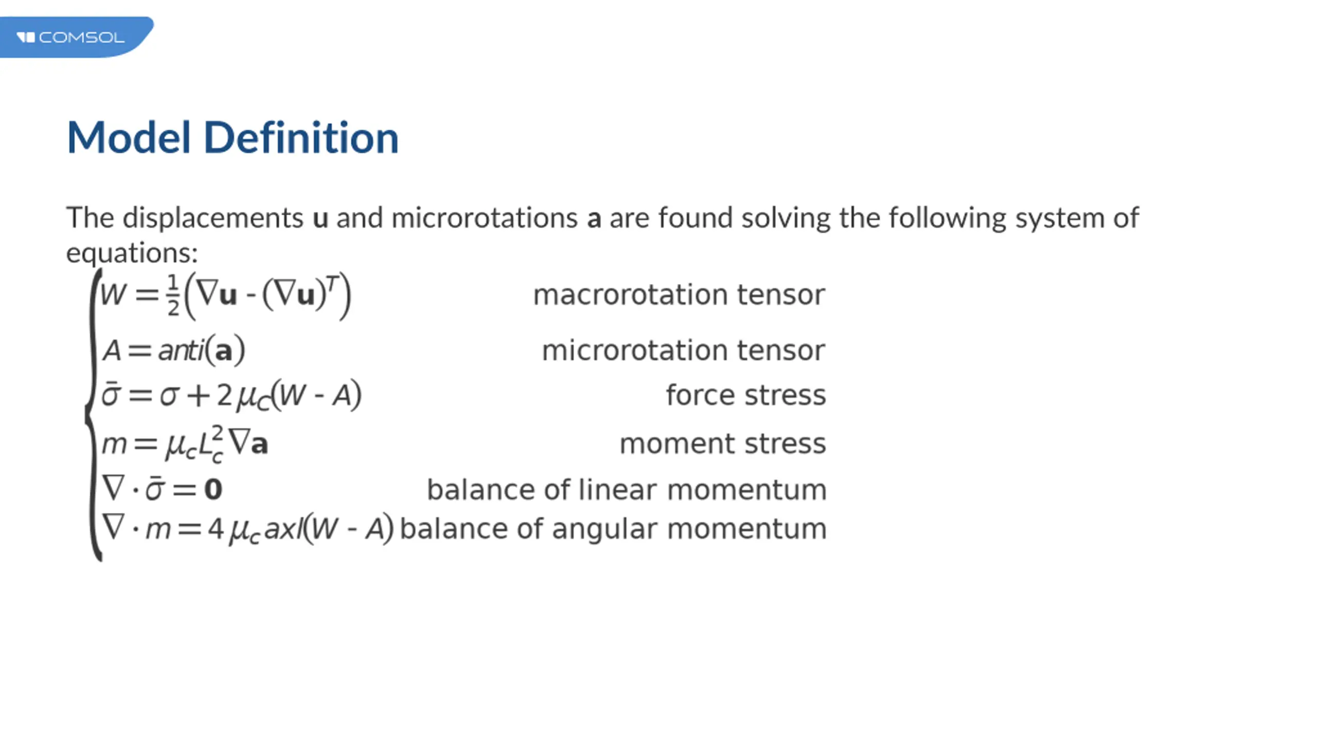 Model Definition The displacements u and microrotations a are found solving the following system of equations: