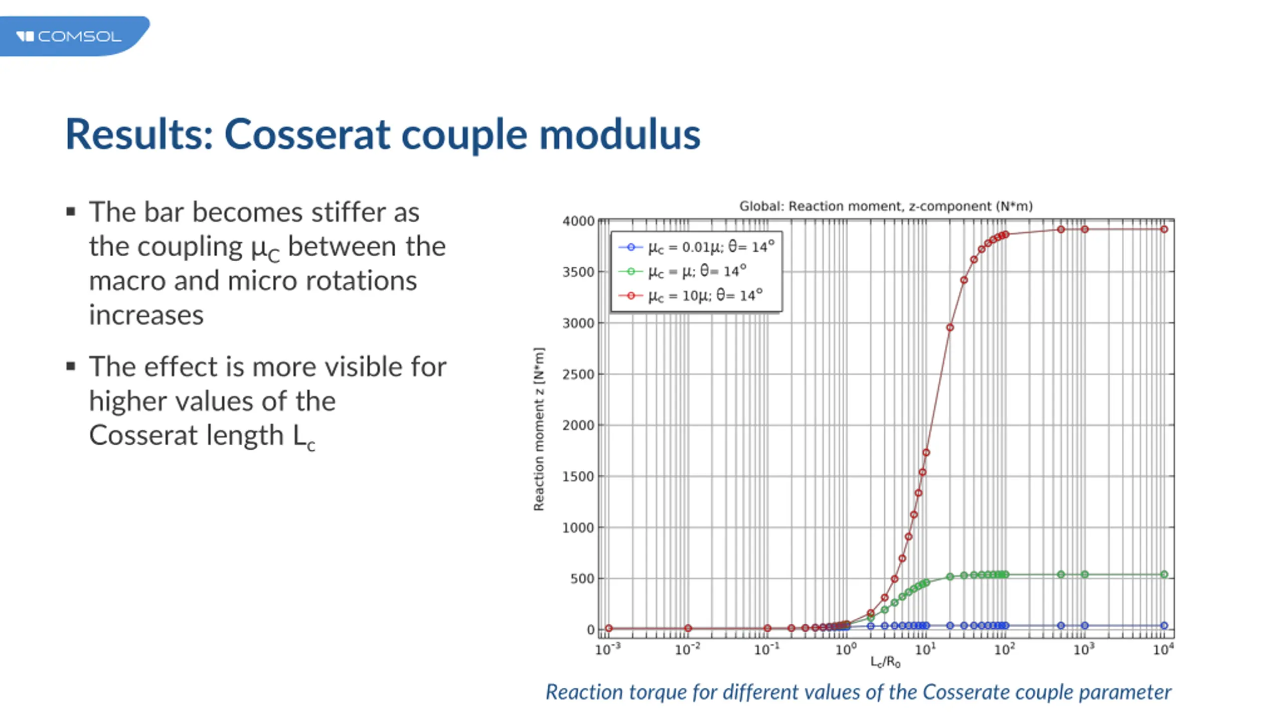 Results: Cosserat couple modulus The bar becomes stiffer as the coupling C between the macro and micro rotations increases The effect is more visible for higher values of the Cosserat length Lc Reaction torque for different values of the Cosserate couple parameter
