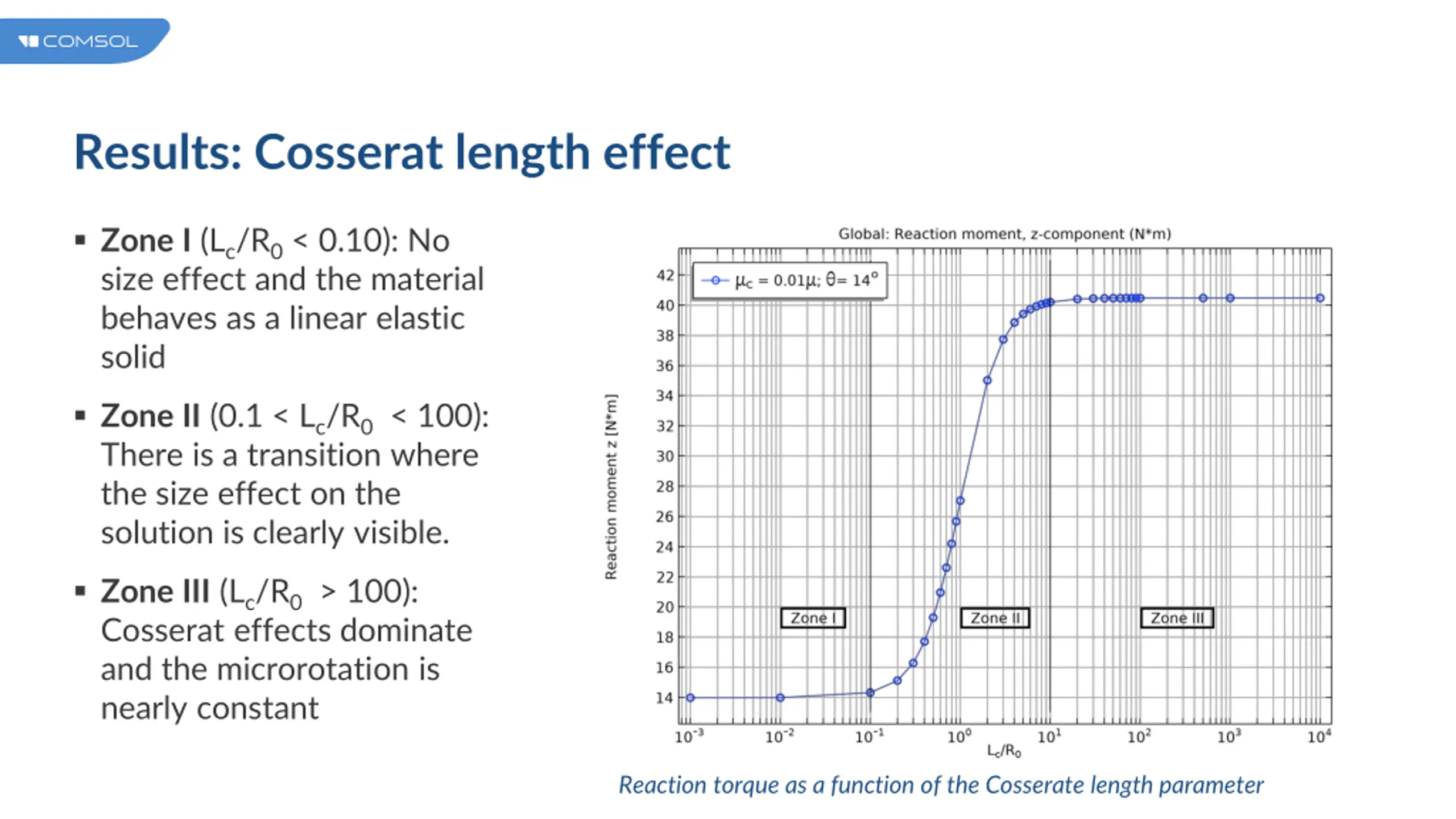 Results: Cosserat length effect Zone I (Lc/R0 < 0.10): No size effect and the material behaves as a linear elastic solid Zone II (0.1 < Lc/R0 < 100): There is a transition where the size effect on the solution is clearly visible. Zone III (Lc/R0 > 100): Cosserat effects dominate and the microrotation is nearly constant Reaction torque as a function of the Cosserate length parameter