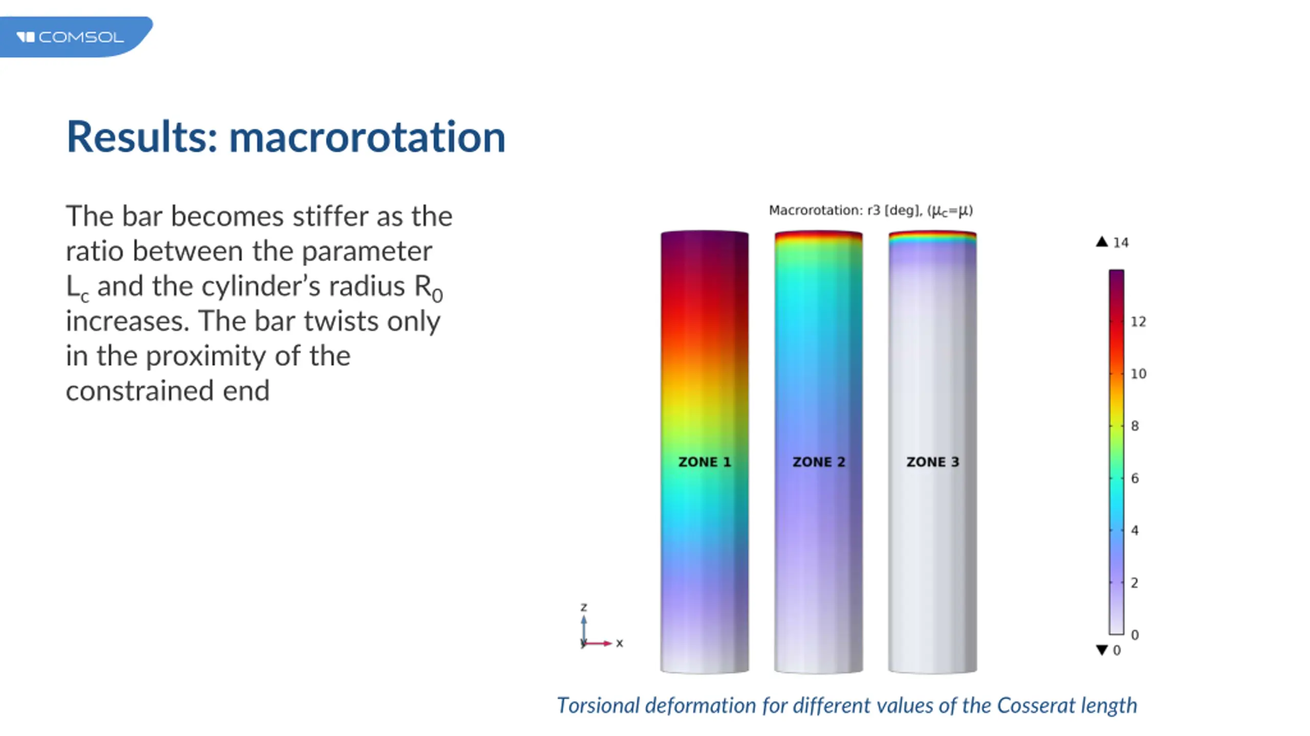 Results: macrorotation The bar becomes stiffer as the ratio between the parameter Lcand the cylinder s radius R0 increases. The bar twists only in the proximity of the constrained end Torsional deformation for different values of the Cosserat length