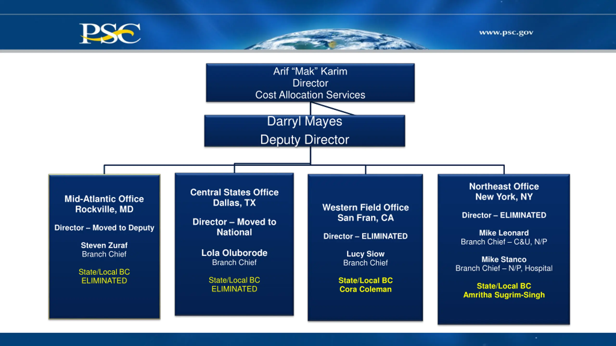Arif Mak Karim Director Cost Allocation Services Darryl Mayes Deputy Director Northeast Office New York, NY Central States Office Dallas, TX Mid-Atlantic Office Rockville, MD Western Field Office San Fran, CA Director ELIMINATED Director Moved to National Director Moved to Deputy Mike Leonard Branch Chief C&U, N/P Director ELIMINATED Steven Zuraf Branch Chief Lola Oluborode Branch Chief Lucy Siow Branch Chief State/Local BC Cora Coleman Mike Stanco Branch Chief N/P, Hospital State/Local BC ELIMINATED State/Local BC ELIMINATED State/Local BC Amritha Sugrim-Singh