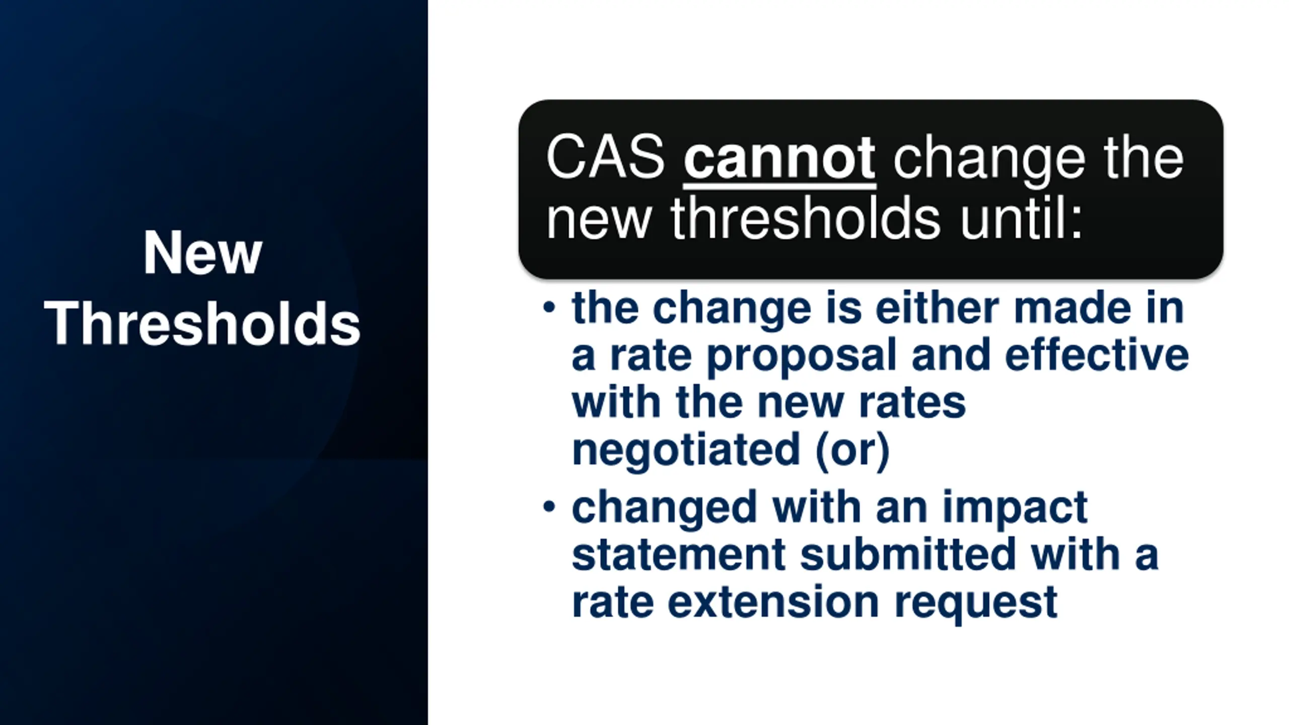 CAS cannot change the new thresholds until: New the change is either made in a rate proposal and effective with the new rates negotiated (or) changed with an impact statement submitted with a rate extension request Thresholds