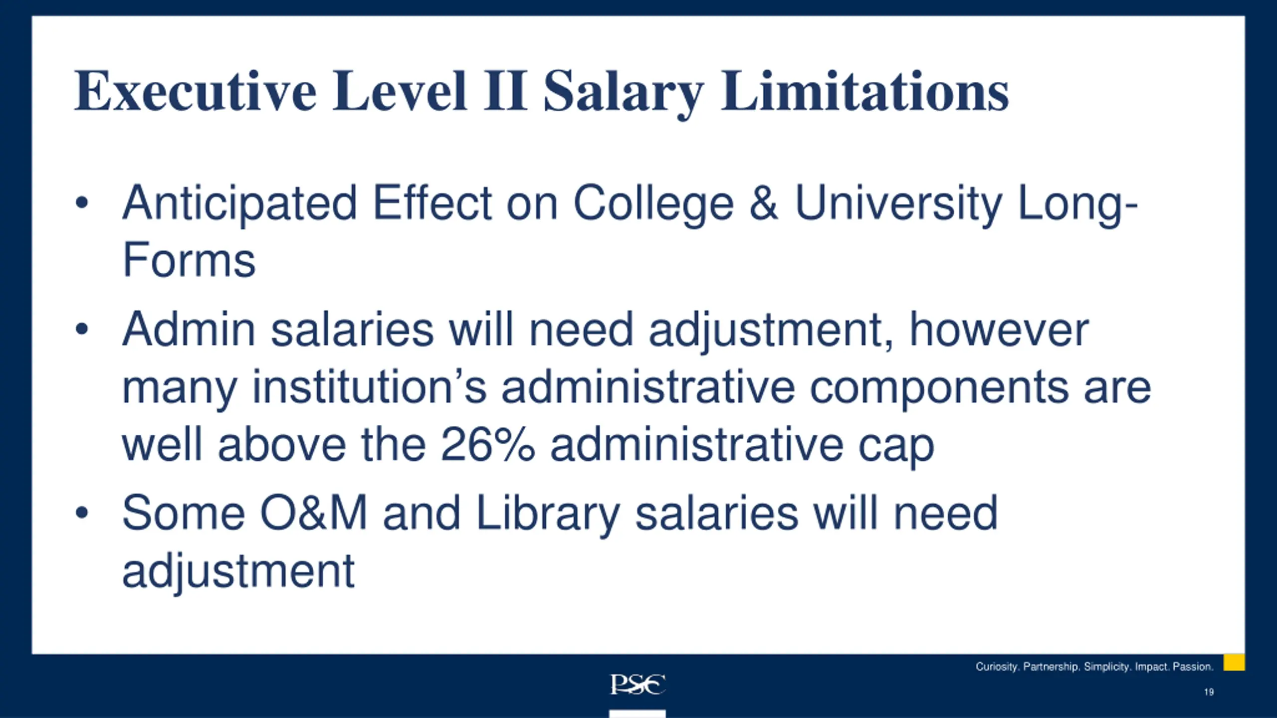 Executive Level II Salary Limitations Anticipated Effect on College & University Long- Forms Admin salaries will need adjustment, however many institution s administrative components are well above the 26% administrative cap Some O&M and Library salaries will need adjustment Curiosity. Partnership. Simplicity. Impact. Passion. 19