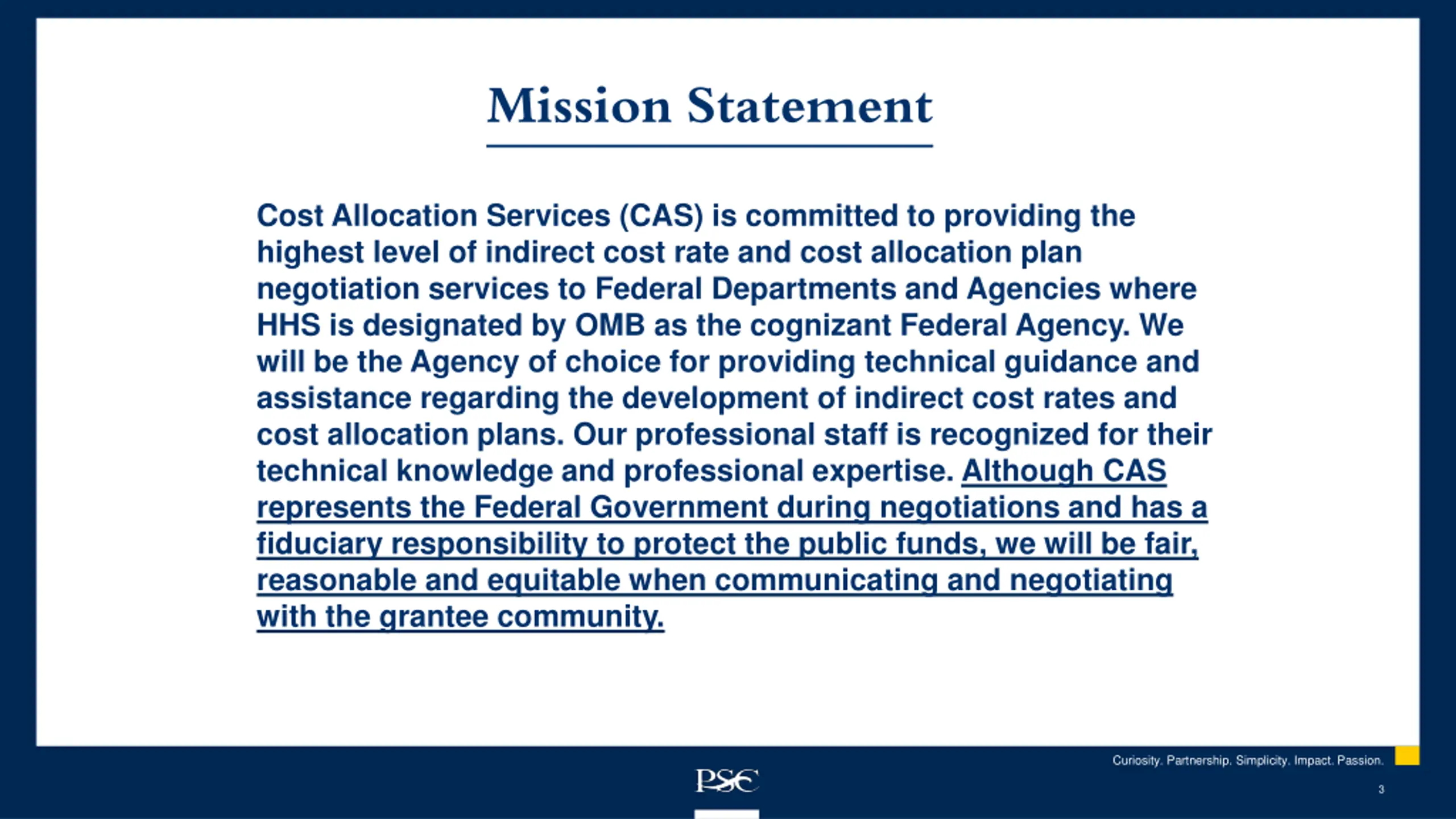 Mission Statement Cost Allocation Services (CAS) is committed to providing the highest level of indirect cost rate and cost allocation plan negotiation services to Federal Departments and Agencies where HHS is designated by OMB as the cognizant Federal Agency. We will be the Agency of choice for providing technical guidance and assistance regarding the development of indirect cost rates and cost allocation plans. Our professional staff is recognized for their technical knowledge and professional expertise. Although CAS represents the Federal Government during negotiations and has a fiduciary responsibility to protect the public funds, we will be fair, reasonable and equitable when communicating and negotiating with the grantee community. Curiosity. Partnership. Simplicity. Impact. Passion. 3