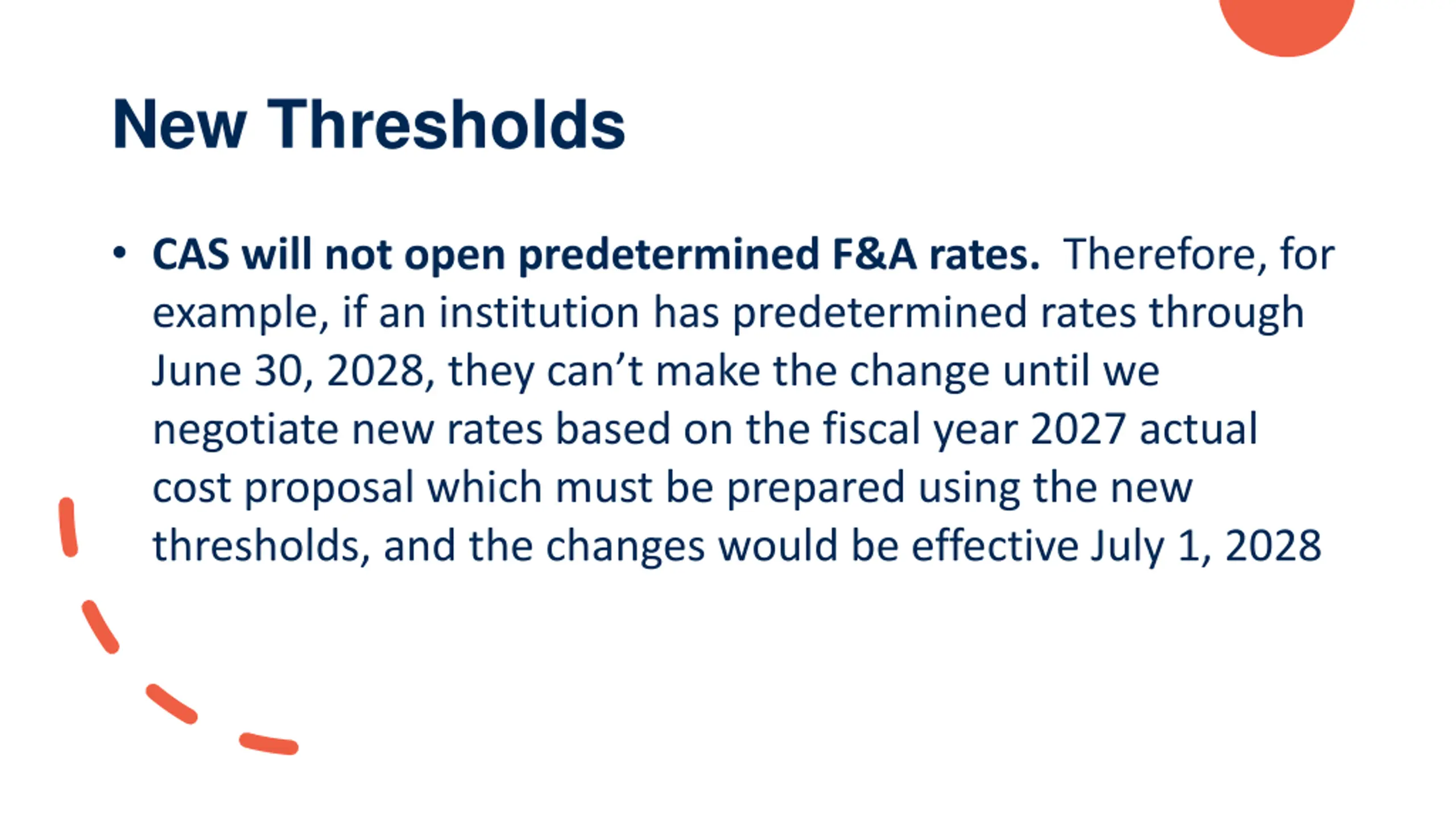 New Thresholds CAS will not open predetermined F&A rates. Therefore, for example, if an institution has predetermined rates through June 30, 2028, they can t make the change until we negotiate new rates based on the fiscal year 2027 actual cost proposal which must be prepared using the new thresholds, and the changes would be effective July 1, 2028